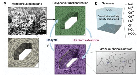 Nuclear fuel uranium plays an increasingly important role in China's national economy and national defense construction. The large-scale development and utilization of nuclear energy have become an inevitable choice with the rapid development of China's economy and the depletion of global fossil energy. Roughly 4.5 billion tons of uranium exists in the ocean, which is 2,000 times more than the amount of uranium found on land. If uranium can be extracted effectively from the ocean, it can provide a nearly inexhaustible supply for nuclear power production. However, the extraction of uranium from seawater is highly challenging due the background high salinity and uranium’s relatively low concentration. Developing high-selective and large-flow separation materials and reducing costs is a difficult point in the development of uranium capture from seawater.
