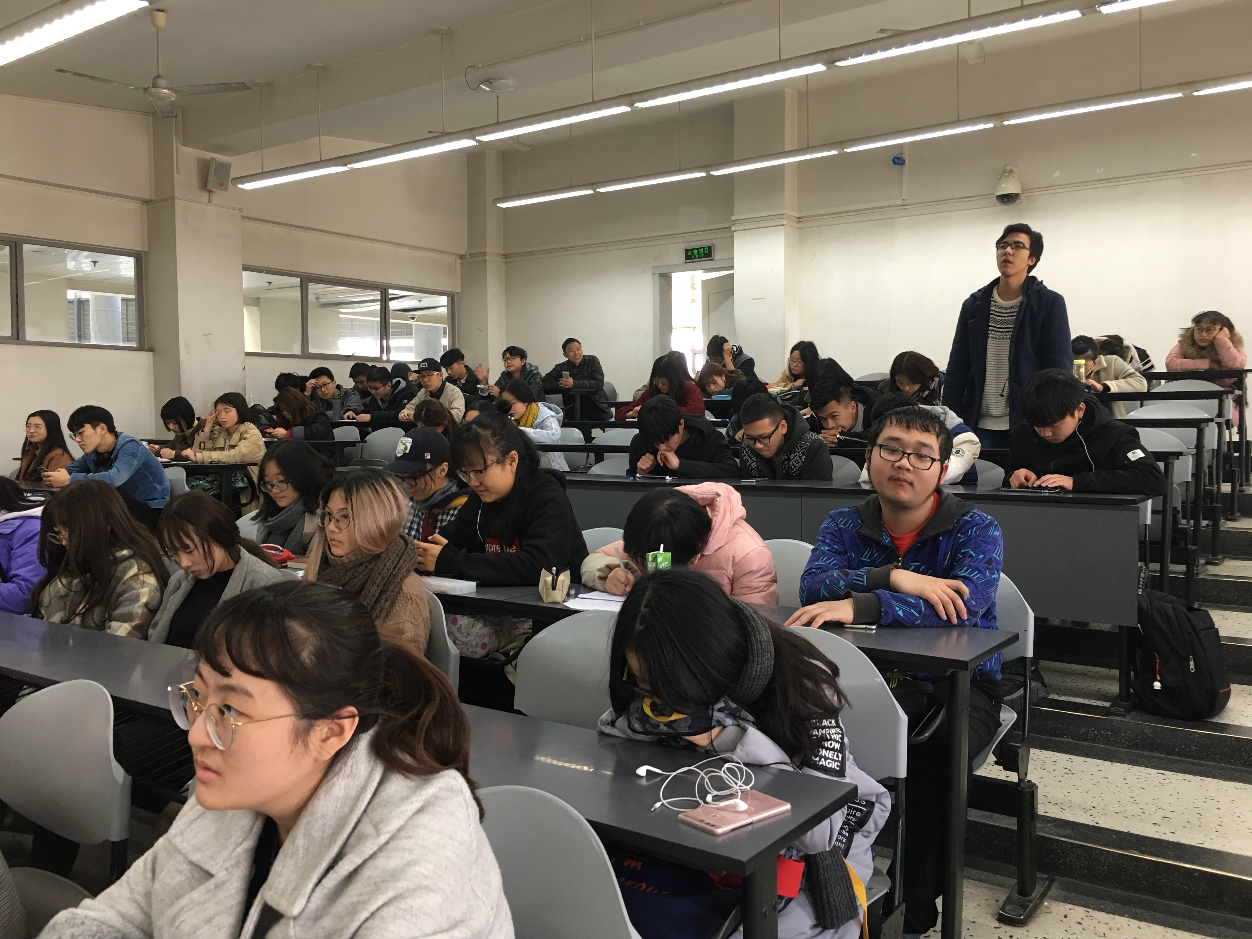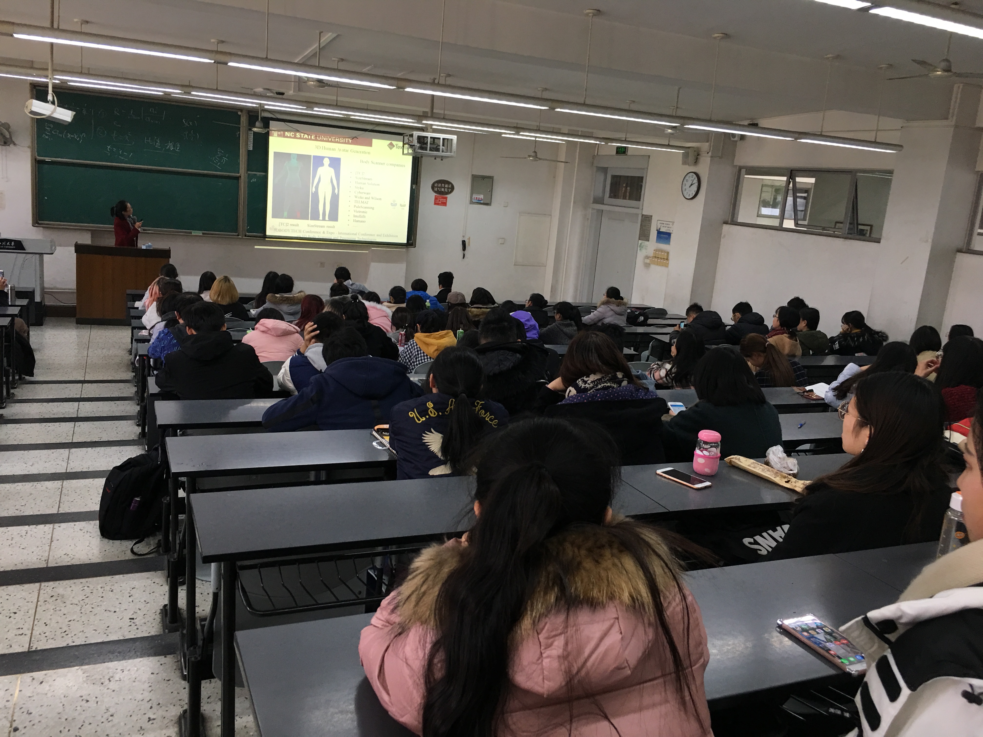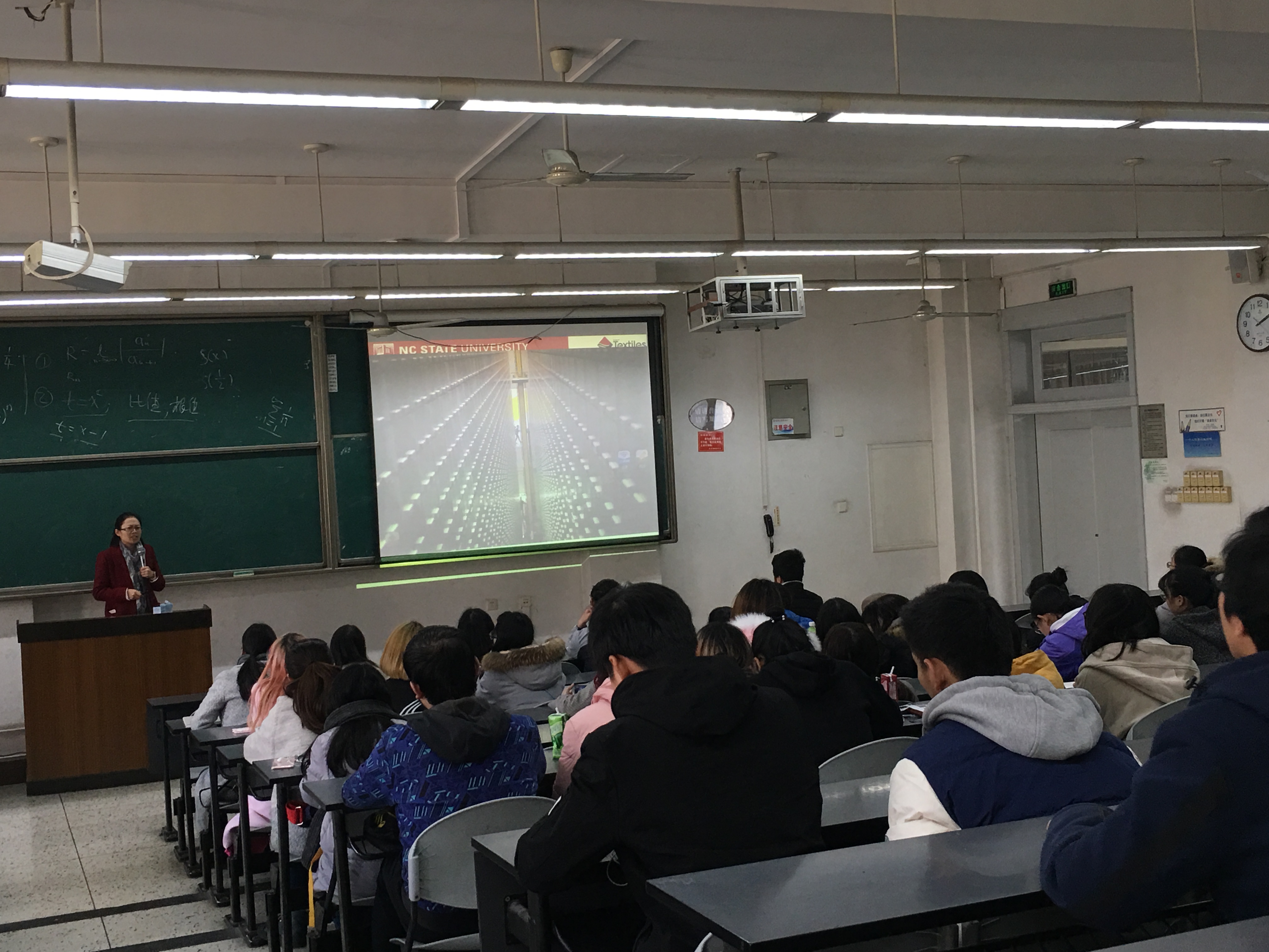 2017年12月20日下午,美国北卡罗莱纳州立大学(North Carolina State University)张芳芳博士受邀在纺织与服装工程系主任郭荣辉副教授、纺织工程教研室主任谭淋副研究员的陪同下,到江安校区一教B401教室做了题为“Study and Work Abroad”的报告。纺织服装工程系纺织工程、服装与服饰设计专业大一和大二本科生聆听了张芳芳博士的精彩报告。
