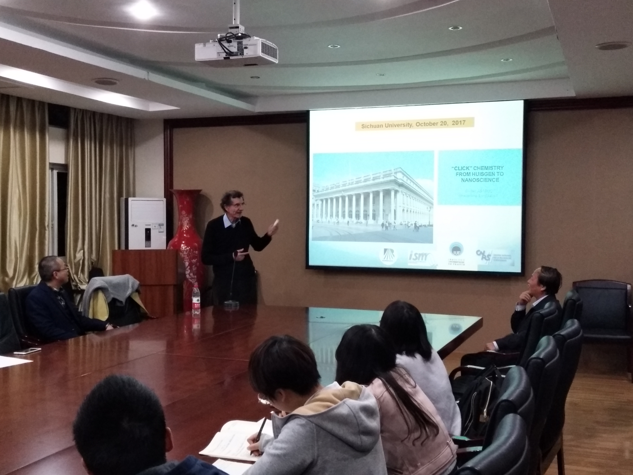 2017年10月20日晚上,四川大学高端外籍教师Didier Astruc院士在望江校区轻纺与食品学院皮革楼209会议室为我院硕、博士研究生作了题为“CLICK CHEMISTRY——FROM HUISGEN TO NANOSCIENCE”的学术讲座”。讲座由四川大学轻纺与食品学院硕士研究生李杨主持,学院何有节院长,辜海彬副教授、但年华副教授、金垚博士以及硕/博士生研究生约40余人聆听了Didier Astruc院士的精彩报告。