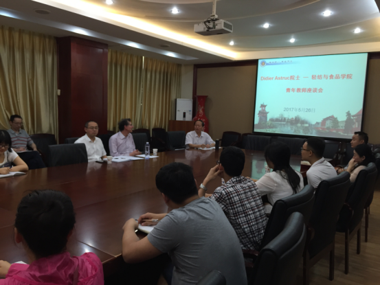 2017年5月26日上午10点在轻纺与食品学院皮革楼209会议室,波尔多第一大学终生教授Didier Astruc为青年教师开设了一场别开生面的座谈会,来自皮革、纺织、食品专业的26位青年教师参加了此次座谈会。由何有节院长主持, Didier Astruc教授介绍了法国高校教师的工作基本情况。老师们就在专业领域研究中遇到的技术问题,向Didier Astruc教授咨询请教,Didier Astruc教授进行全面详细的解答。同时欢迎我院青年教师到法国第一大学进行学术交流和访问。