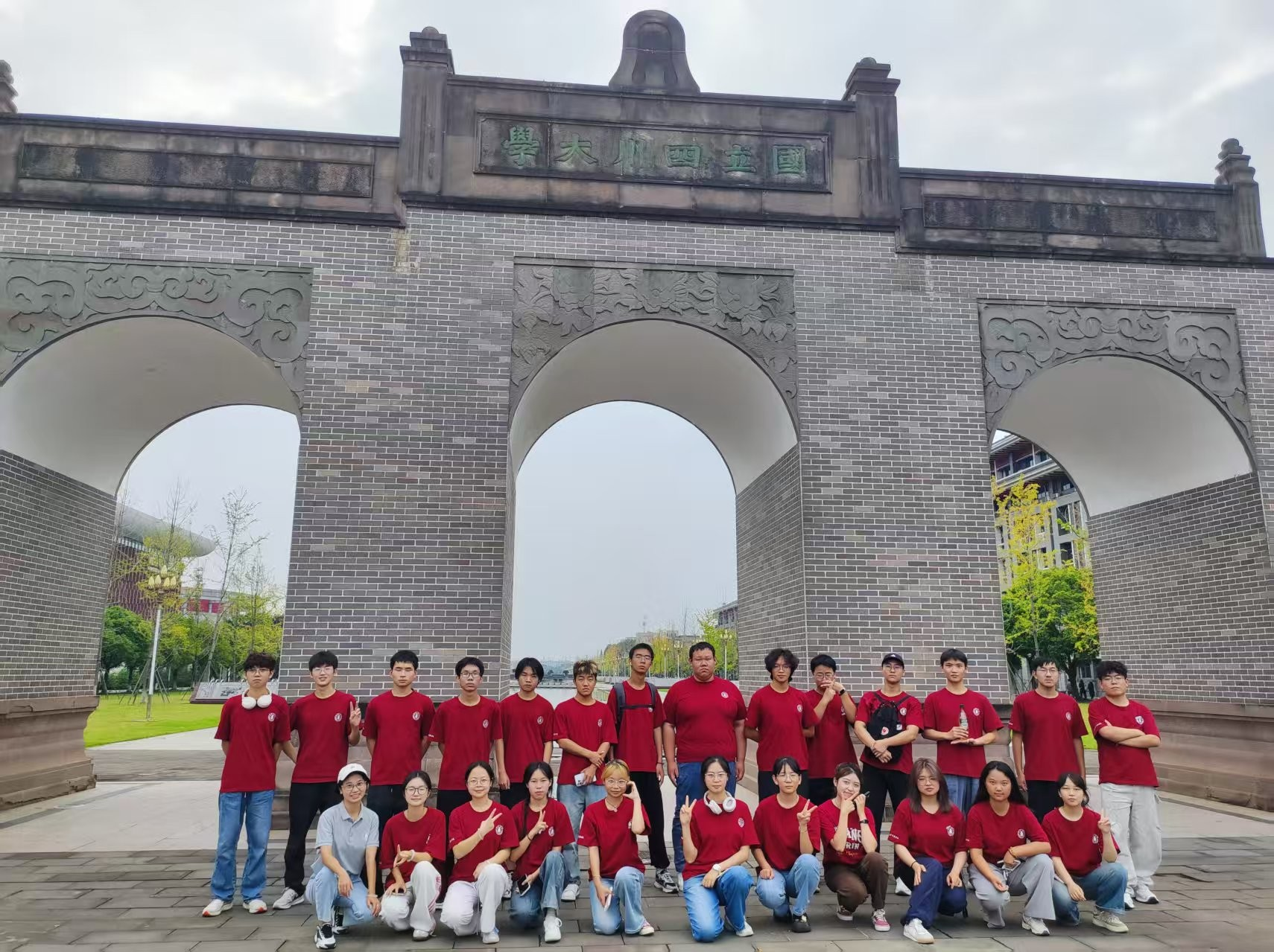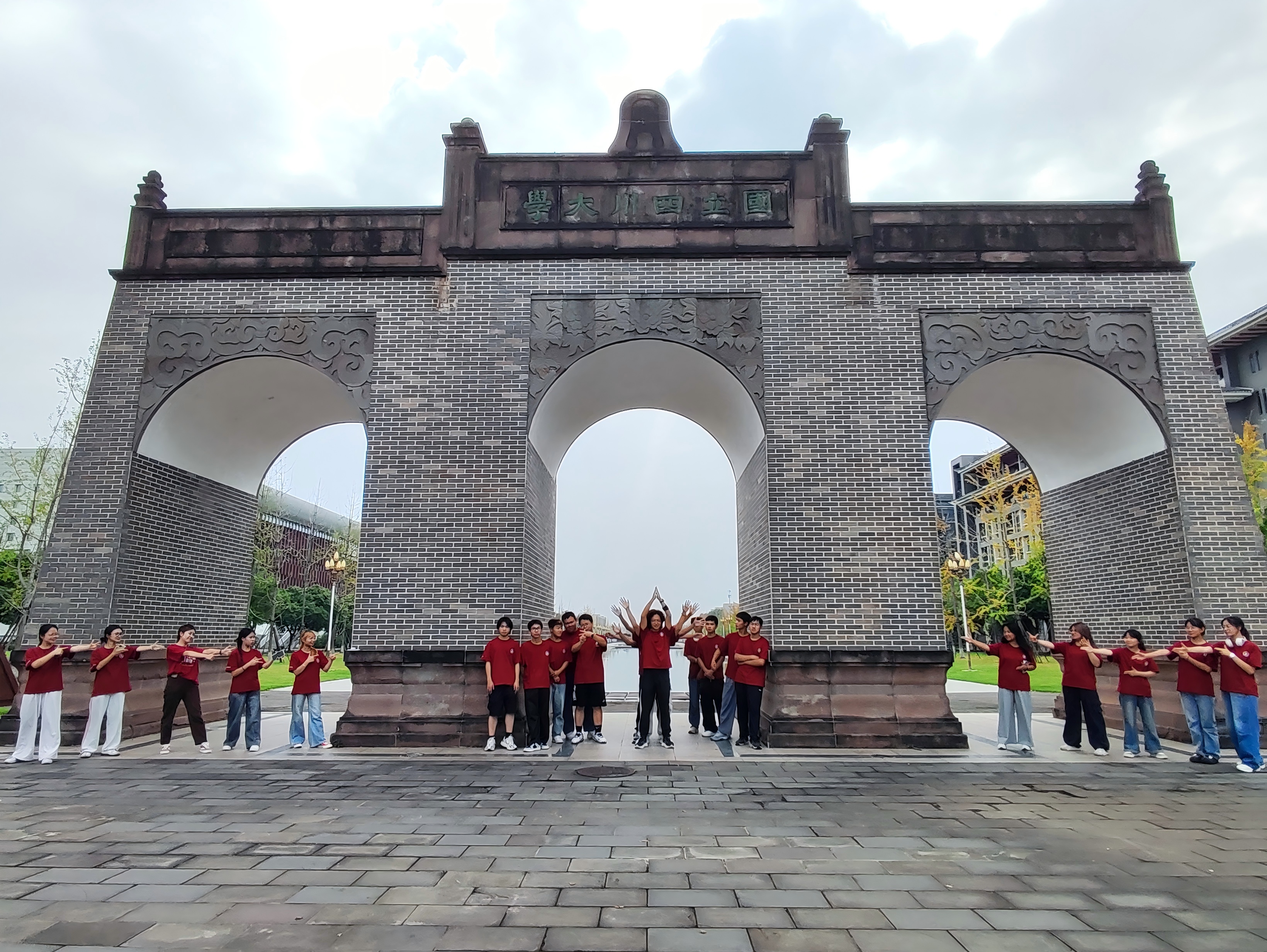 “国立四川大学”牌坊前,全班身着红色文化衫完成了大学的第一张集体合影。同学们或在拱门间以错位拍摄打造“千手”造型,灵动趣味;或全员集结摆出创意队形,红色文化衫与灰砖古建筑的碰撞,将青春朝气与历史建筑的厚重巧妙融合。这处复刻的历史牌坊,砖雕纹饰精致典雅,是川大校史的具象缩影,同学们的打卡合影,让历史地标有了青春的注解。