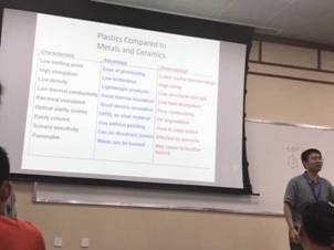 Luyi Sun教授以其强大的工科背景,使用生活中常见的物品为案例,并结合在工厂拍摄的大量影视资料,生动形象地为学生讲解了聚合物的各种加工方式,如挤出、注射、吹塑、压延、模压、静电纺丝和3D打印等。一瓶1元的矿泉水,也许我们喝完会把它丢掉,但在Sun教授那里却成了很好的教学素材。他分别就如何选择矿泉水瓶的原料、如何设计瓶身的大小和厚度、如何选用合适的加工方法、如何得到瓶盖和瓶身上的螺纹以及在加工过程中注意的事项等问题进行讲解,使学生在感叹小小塑料瓶竟有如此多的学问的同时,也加深了对各种加工方法的理解。
