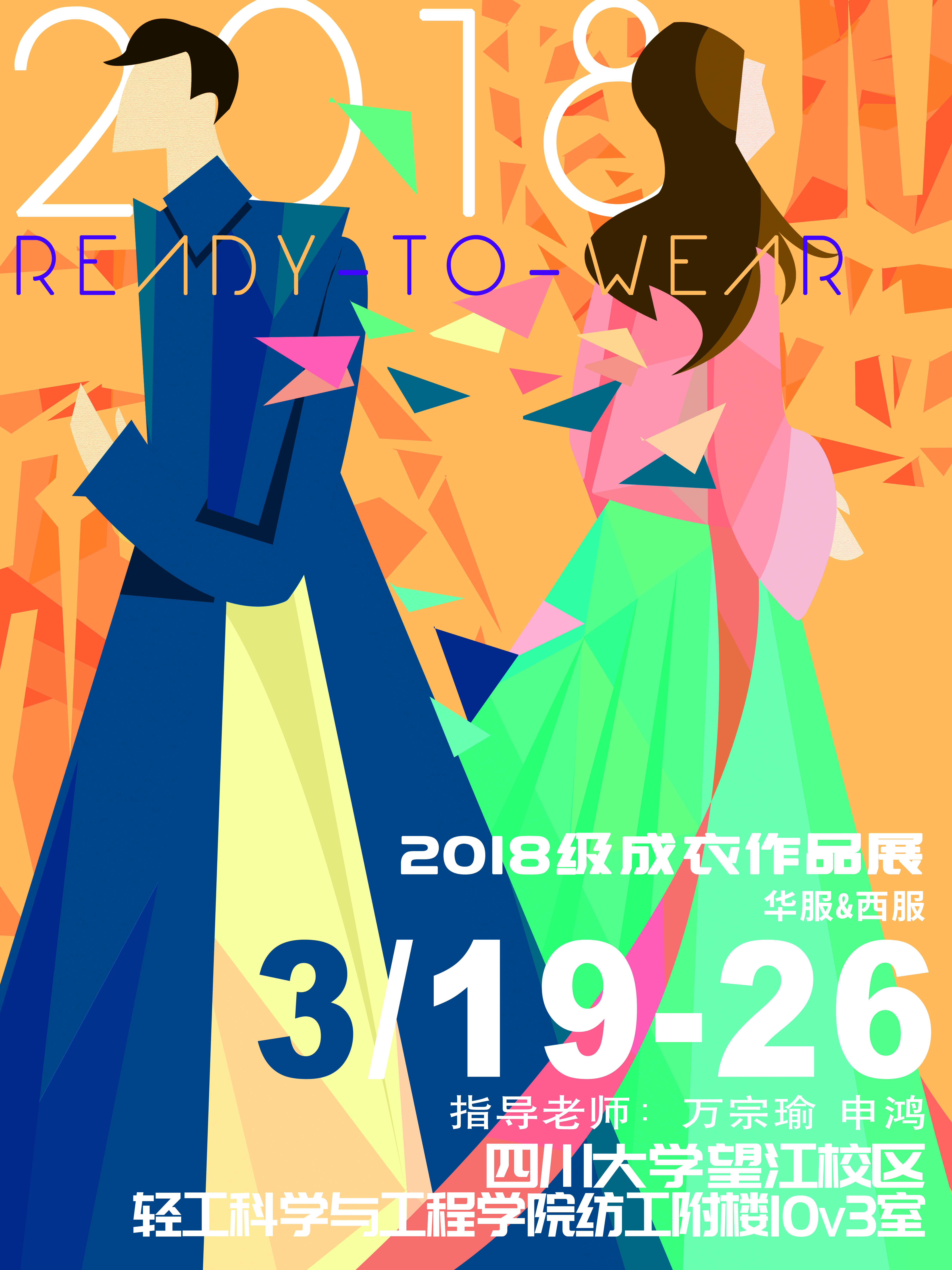 万宗瑜、申鸿老师为本次课程教学成果展做全程指导。课程组教师通过组织学生对教学成果作品向外展览、交流,有助于培养学生夯实基础,并从其他同学作品中得到灵感启发,激发学生学习与创作的激情,而且学生通过布展实践,既是对课程“服装陈列”的实际应用,也营造艺术氛围和分享作品带来的愉悦气氛。