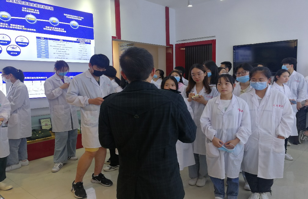 参观四川高福记生物科技有限公司,在科普展厅中,工作人员详细介绍了企业发展文化、酱腌菜的发展历史、原生植物源益生菌研发历程等,同时与学生们探讨益生菌和乳酸菌两者的概念及区别,引发同学们对益生菌研究利用的思考。