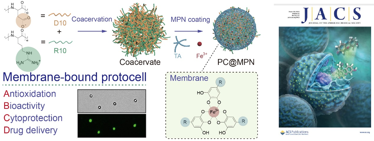 近日,四川大学周加境研究员与华西口腔医学院刘磊教授、墨尔本大学Frank Caruso教授团队合作,开发了一种基于凝聚体和金属多酚网络的新型原始细胞模型(peptide coacervate@metal−phenolic networks,PC@MPNs),并证明了其作为药物递送平台的潜力,该研究成果以题为“Peptide-Based Coacervate Protocells with Cytoprotective Metal−Phenolic Network Membranes”发表于国际化学顶级期刊《Journal of the American Chemical Society》(影响因子16.383;川大A-),并入选封面论文。研究以相反电荷寡肽形成的凝聚体模拟细胞质,利用金属多酚网络模拟细胞膜,构建了一种新型的原始细胞系统PC@MPNs。这种原始细胞能高效地负载各种生物活性大分子,如牛血清白蛋白和免疫球蛋白G。同时,金属多酚网络细胞膜不仅能够稳定凝聚体,还赋予原始细胞选择透过性以及优异的自由基清除能力。该PC@MPNs能够模拟细胞信号传递进行生物催化级联反应,并通过表面修饰各类功能分子进一步模拟真实细胞的结构。研究证明,负载抗癌药阿霉素并被叶酸修饰后的PC@MPNs可被用于治疗鳞状细胞癌,具有作为药物递送平台的巨大潜力。