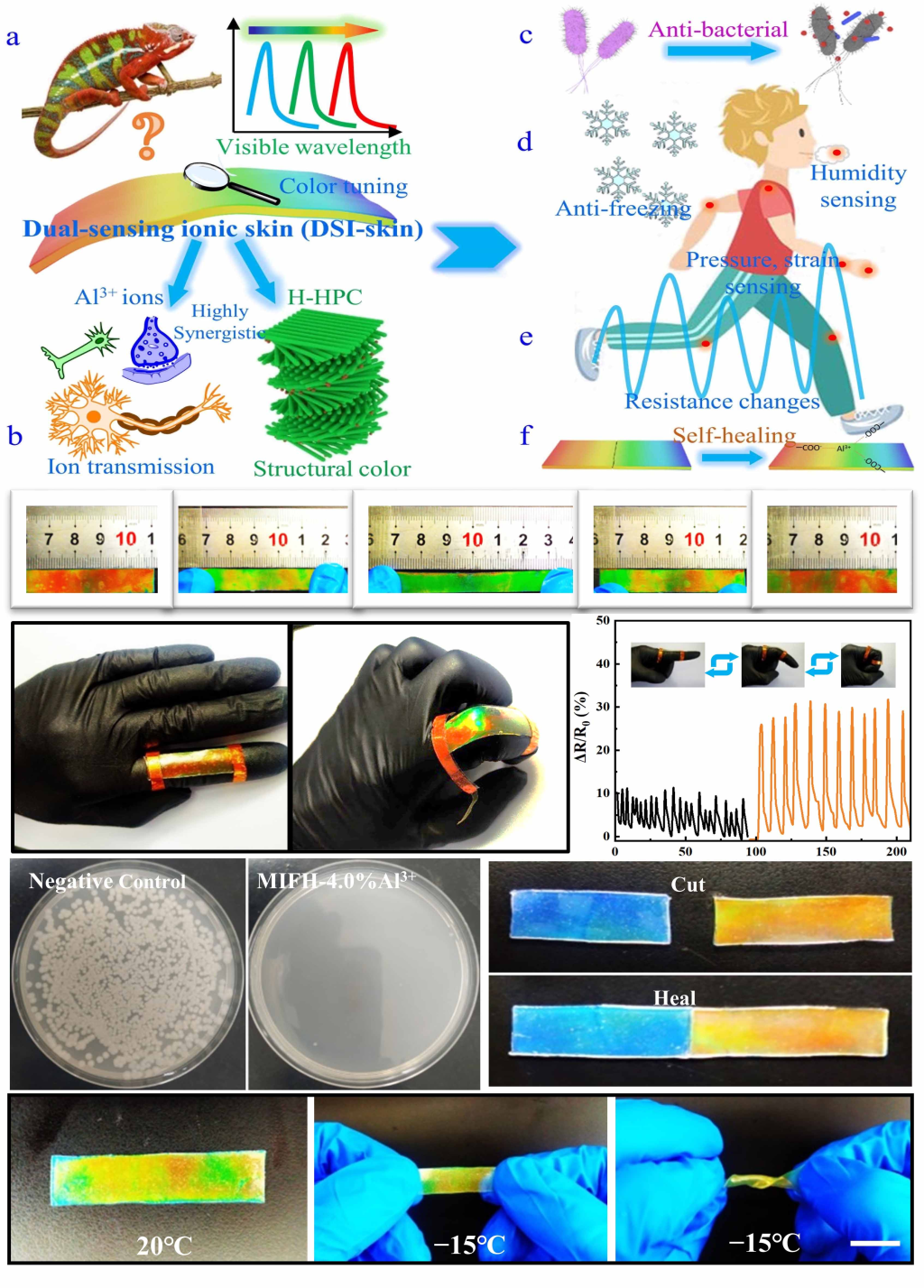 DSI-skin仿生离子皮肤是在含有羧酸根的水凝胶三维网络中,通过引入Al3+离子来赋予材料离子传导能力,并利用高取代的羟丙基纤维素(H-HPC)形成胆淄相液晶结构色赋予材料灵敏的变色能力,从而首次实现了同时光电双模式响应拉伸、压力和湿度,不仅能够通过电阻的变化显示电信号,而且可以通过调节液晶相的螺距来反映鲜艳的视觉信息,具备数字化、可视化地监控人体运动和呼气的功能。同时借助Al3+离子和H-HPC的高度协同效应,实现了快速的颜色调控(426-641nm)、出色的抗菌(Log Reduction>3.43)、自愈(85.0% efficiency)和抗冻(-15℃)等功能特性。这些实用的功能延长了材料使用寿命,扩大了其在许多领域的实际应用。该研究结果将为高性能仿生皮肤、可穿戴设备和生物传感器制造提供必要的设计指导。
