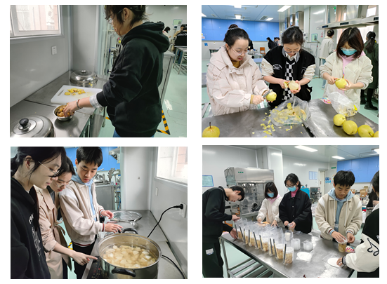 首先,主讲人介绍了大雪节气的特点、民俗活动等知识。随后,活动负责人详细介绍并演示了姜茶和冰糖炖梨的制作方法。支部成员分为两组分别进行操作。同志们分工有序、认真细致地进行原材料处理、姜茶炖梨熬煮、装杯打包等工序。