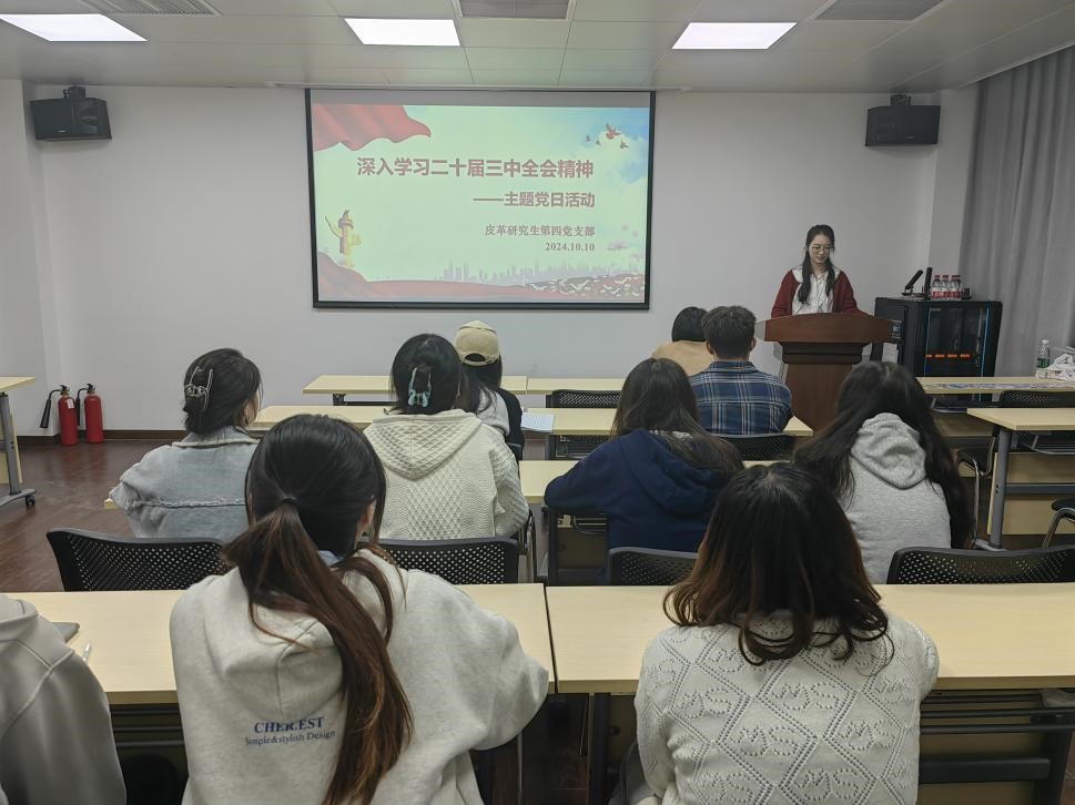 为加强支部党员同志对党的方针政策深入理解,明确自己的职责和任务,为推动党和国家事业作出更大贡献,365英国上市集团皮革研究生第四党支部于2024年10月11日16:00在皮革楼205教室开展“深入学习二十届三中全会精神”主题党日活动。本次活动由宣传委员孟慧涓同志主持。