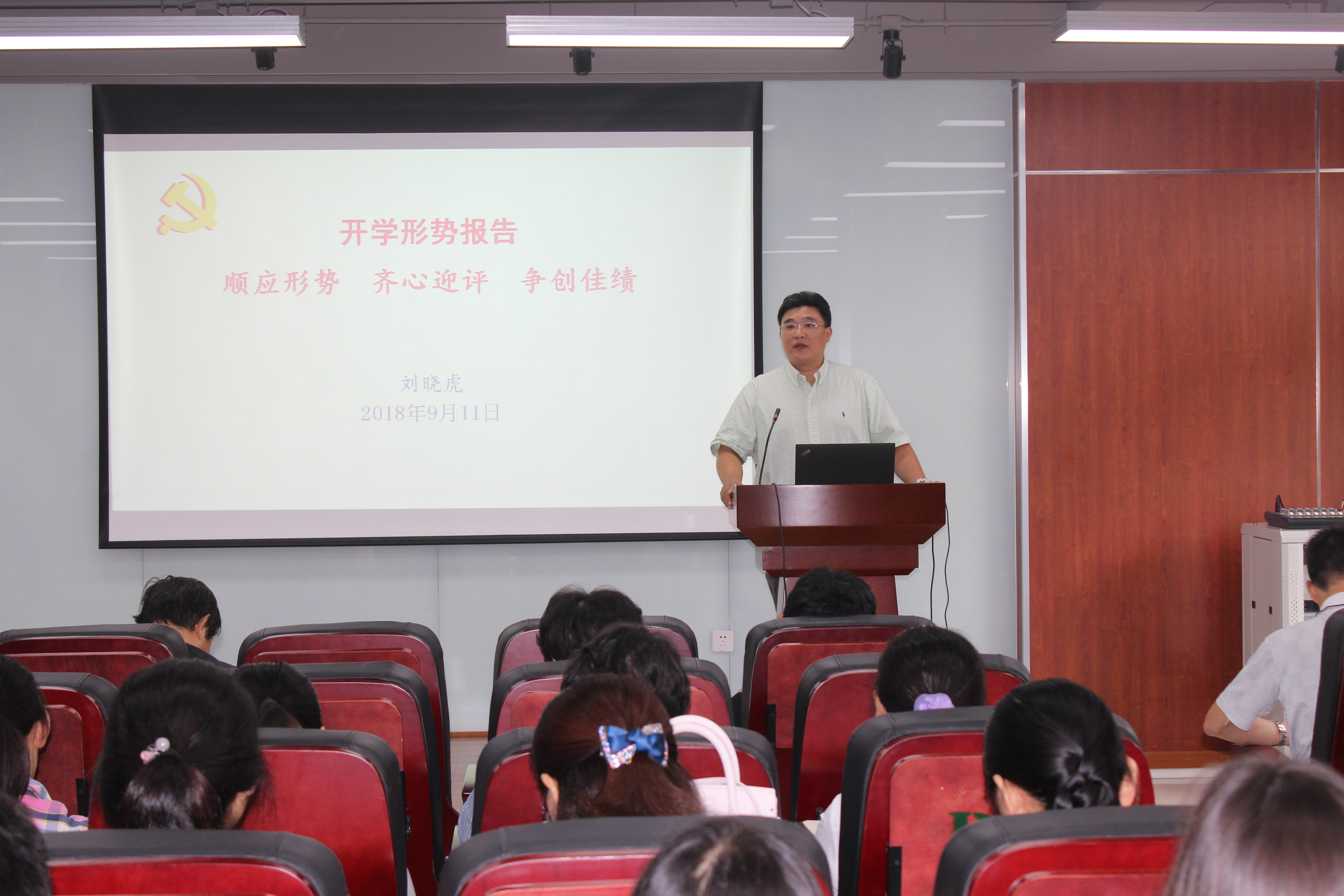 2018年9月11日下午三点,学院在皮革楼报告厅召开全院教师大会,学院党委书记刘晓虎代表学院党政向全体教师做了开学形势报告。