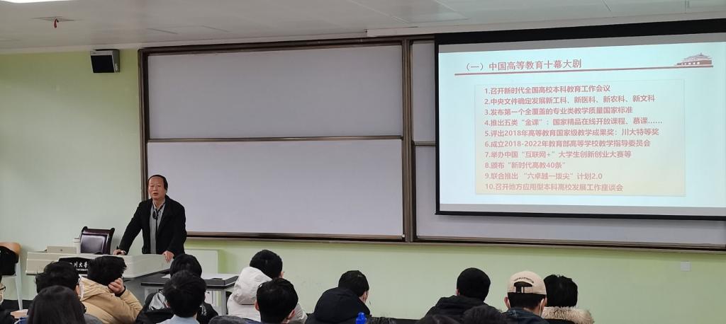 何有节院长根据个人学习体会与个人经历,从国家层面、教育层面、学校层面及学院层面三个部分分别进行讲授。