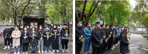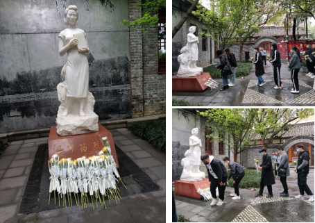 在党支部潘申财同志的组织下,支部成员手持寄托哀思的菊花,肃穆站立,认真倾听《江姐之歌》,齐声歌唱国歌后低头默哀三分钟,并献花于江姐雕塑,传达党员同志对江姐及其他川大革命烈士的哀思。随后,支部成员参观江姐纪念馆与四川大学英烈陈列馆,循先辈足迹,承红色精神。