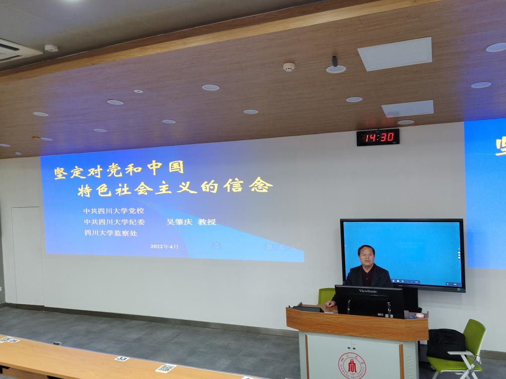同日下午,四川大学原纪委副书记、监察处处长吴肇庆教授为学员们讲授了“坚定对党和中国特色社会主义的信念”专题党课。首先,吴教授以习近平总书记关于理想信念是共产党人的政治灵魂,共产党员要坚定理想信念、补足精神之钙的论述,以朱德元帅、周恩来总理等革命先辈和钱学森等院士为例,向学员们阐述了树立共产主义信念的重要性。他还从理论与多个事例的结合上,阐明共产党人只有坚定对党和中国特色社会主义的信念,才能坚定共产主义信念,从而为中国特色社会主义建设和共产主义奋斗终生,并做出应有的贡献。随后,吴教授通过分析我们党的执政地位和改革开放形势,以及国际敌对势力对我们的西化分化与遏制战略,向学员们阐明了坚定对党信念的必要性。他以国际国内事例的分析,指出只有坚定对党和中国特色社会主义的信念,才能坚定捍卫党的领导,才能战胜敌对势力的打压,使中国特色社会主义蓬勃发展。此外,吴教授还强调,广大发展对象和青年学子应加强党建理论学习,积极参加社会实践,在理论与实践的结合中坚定对党和中国特色社会主义的信念,志存高远,脚踏实地,勇做时代的弄潮儿,在实现中国梦的生动实践中放飞青春梦想,在为党和人民利益的不懈奋斗中书写人生华章!