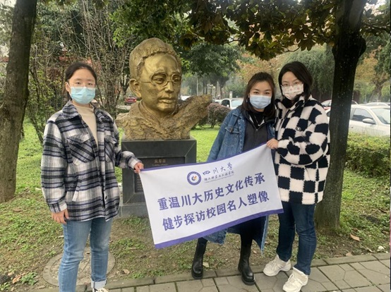 雕塑之中有红色革命家,有投身祖国建设的专家学者,大家每每寻到一处雕塑,就像找到了生活中的小确幸,除了合影,大家也积极交流原本熟悉或者不熟悉的雕塑名人故事,学习他们为中国、为川大做出的积极贡献。