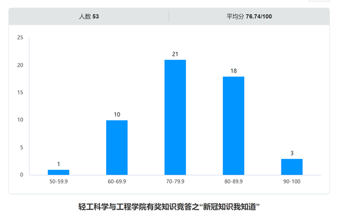至12月16日下午三点,新冠知识竞答结束,线上参与竞答教职工53人,人均得分76.74,大部分得分在70-89分之间。参与的教职工普遍反映通过此次竞答增加了个人对新冠知识的了解。
