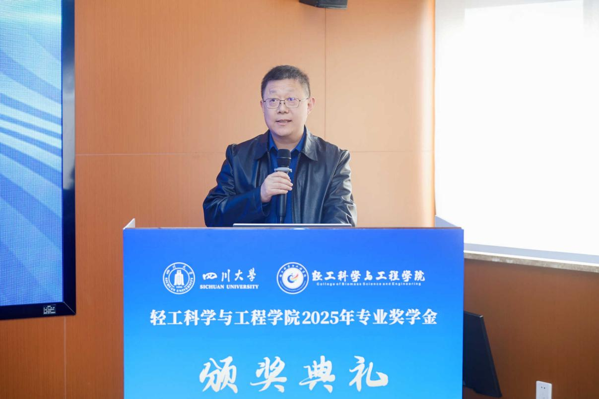 设奖单位代表陈占光副理事长致辞,他肯定了获奖同学的付出,高度评价了捐资助学对产教融合、人才成长的推动作用,同时寄语学子要夯实专业基础、培育创新思维,为皮革行业高质量发展和制造强国建设贡献青春力量。