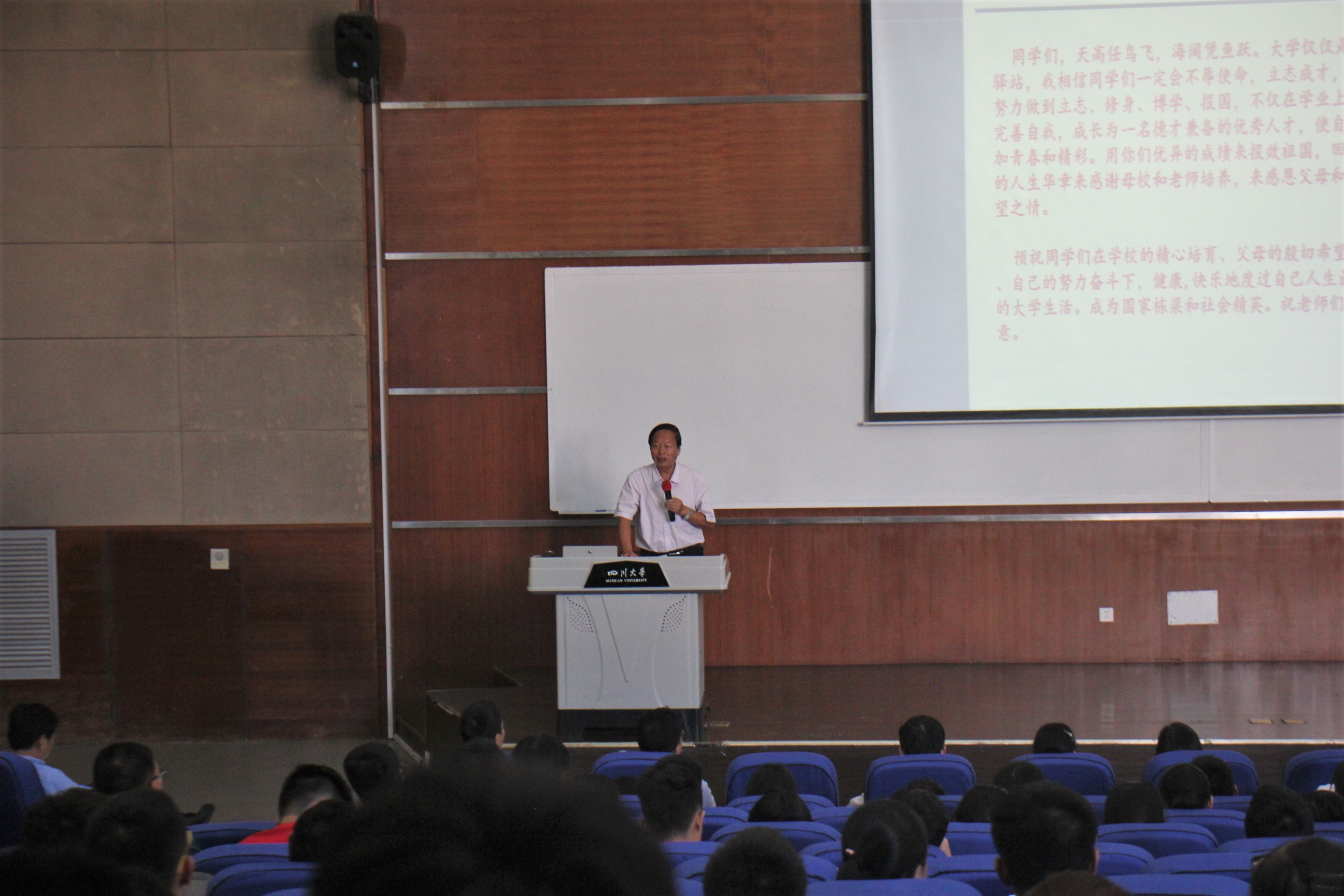 2017年9月11日,轻纺与食品学院2017级本科新生开学典礼暨入学教育大会在四川大学江安校区综合楼C407顺利举行。党委书记刘晓虎副教授,院长何有节教授,副院长兰建武教授,副院长何强教授,院长助理、纺织与服装工程系副系主任郭荣辉副教授,纺织与服装工程系副系主任申鸿副教授,教师代表王海波副教授,教导员吕振生老师,学生科科长冯国涛老师,院团委书记苏德强老师,17级辅导员向星烨老师、李杨老师以及全体2017级本科新生参加了本次活动。开学典礼由刘晓虎书记主持。