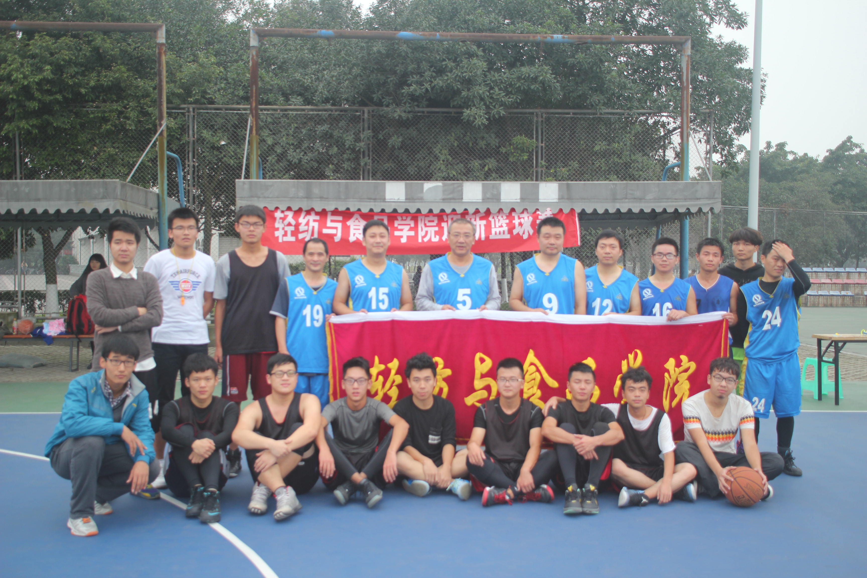 2015年11月21日,由轻纺与食品学院团委学生会体育部主办的轻纺与食品学院2015年师生迎新篮球赛于四川大学江安校区二号篮球场顺利举行。此次比赛的对战双方为我院教师代表队和学生代表队。我院党委赵毅书记,副院长肖凯老师,团委书记苏德强老师,程海明老师,周晋老师以及钟凯老师代表教师参赛,学生代表队参与者为我院篮球队部分成员。