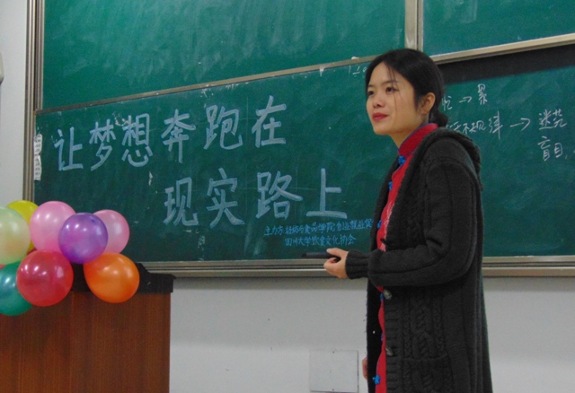 2014年12月7日19:00,“让梦想奔跑在现实路上”讲座在四川大学江安校区综合楼C座404教室顺利举行。本次讲座轻纺与食品学院团委学生会创业就业促进部和四川大学饮食文化协会联合举办,并邀请到了作家梁龙蜀女士作为主讲嘉宾分享自身的职场体验。