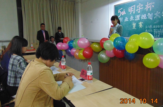 2014年10月14日19:00,第五届“明宇杯”职业生涯规划大赛复赛在四川大学江安校区第一教学楼A教A613教室顺利召开。此次大赛由四川大学团委创业就业促进部主办,轻纺与食品学院创业就业促进部与商学院创业就业促进部共同承办。到场的嘉宾评委有四川大学招生就业工作处马亚婧老师,我院团委副书记李晓秀老师,商学院2011级学生会主席、四川大学联合利华俱乐部副主席高晓昂同学。