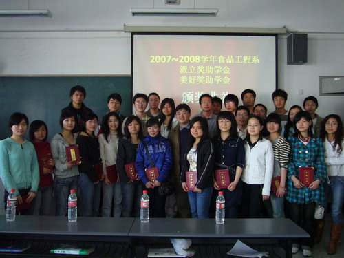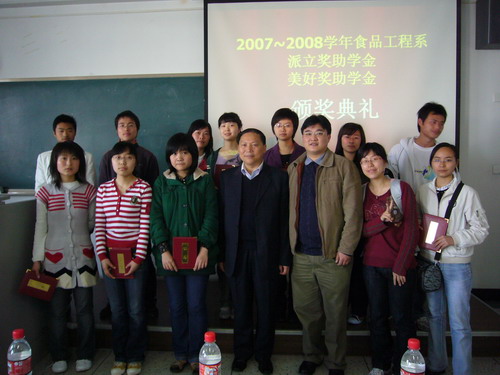 2008年3月26日上午9:00,四川大学—美好奖助学金、派立奖助学金颁奖典礼在江安校区一教B503隆重举行。出席本次颁奖典礼的嘉宾及院领导有派立食品有限公司陈贵良总经理,轻纺与食品学院党委副书记刘晓虎副教授。颁奖典礼由冯国涛老师主持,2006级食品科学与工程专业的全体同学及各年级获奖同学共计100余人参加了本次颁奖典礼。