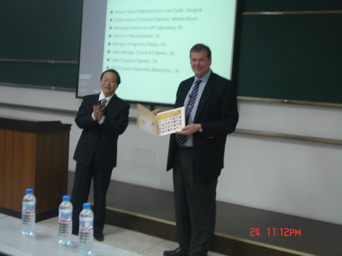 2007年10月24日, Clariant公司亚太地区总裁Gary Fielding先生,Stefanie Nehlsen女士,Clariant公司大中华区销售部经理、四川大学皮革系杰出校友马军龙先生以及Clariant公司广州分公司GTC行政经理李艳女士一行四人访问我校。并于25日上午9:30—11:30在综合楼C207隆重举行学术报告会暨实习奖颁奖典礼。轻纺与食品学院副院长何有节教授、党委副书记刘晓虎老师、冯国涛老师、李晓秀老师、段飞霞老师、罗魏老师以及2007级新生、2004级获奖同学等300人出席了报告会。报告会由刘晓虎老师主持。