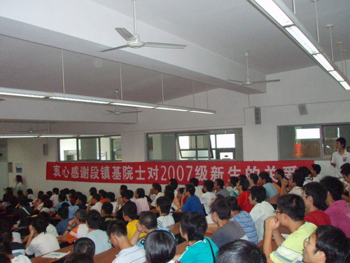 报告会前,同学自发在会场挂上了“衷心感谢段镇基院士对2007级新生的关爱”、“今天是川大勤奋学子,明天做皮革行业巨子”的横幅。