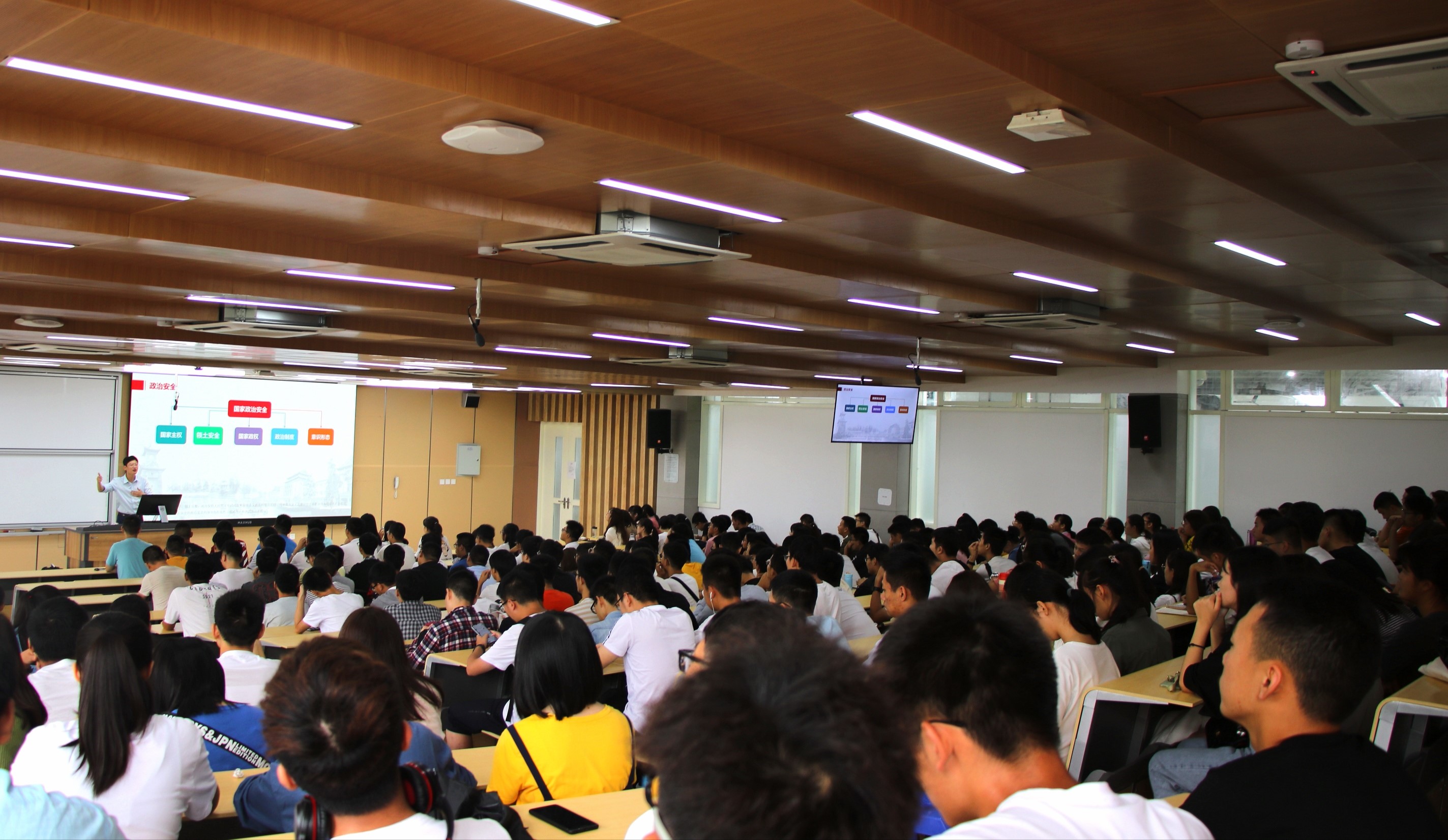一开场,李佳伟老师诙谐幽默的介绍让现场气氛活跃了起来。李佳伟老师把整体版块分为政治安全、网络信息发布安全、消防安全、财产安全、交通安全和人身安全来讲解。在讲解的过程中,李佳伟老师穿插了很多热点时政与学校同学发生的不安全的例子以及视频,强调了学校火灾安全和大学生人身安全。既让讲座内容热闹、有趣,又让同学们认识到了很多身边的不安全因素,达到了让同学们提防身边不安全因素的作用。