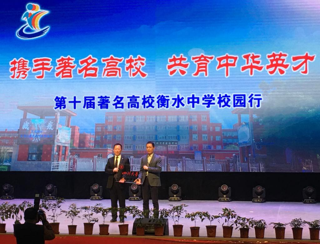 在“校园大学节”期间,参会老师参加各高中学校大学节开幕式,充分认识与了解高中的生源特点与生源优势,并与高中学校领导班子深入交流,就招生宣讲、专家报告、学生在大学期间综合表现等进行了充分交流,进一步加强与高中学校的交流与合作。同时,冯国涛副书记还代表学校授予衡水中学四川大学“优质生源基地”。