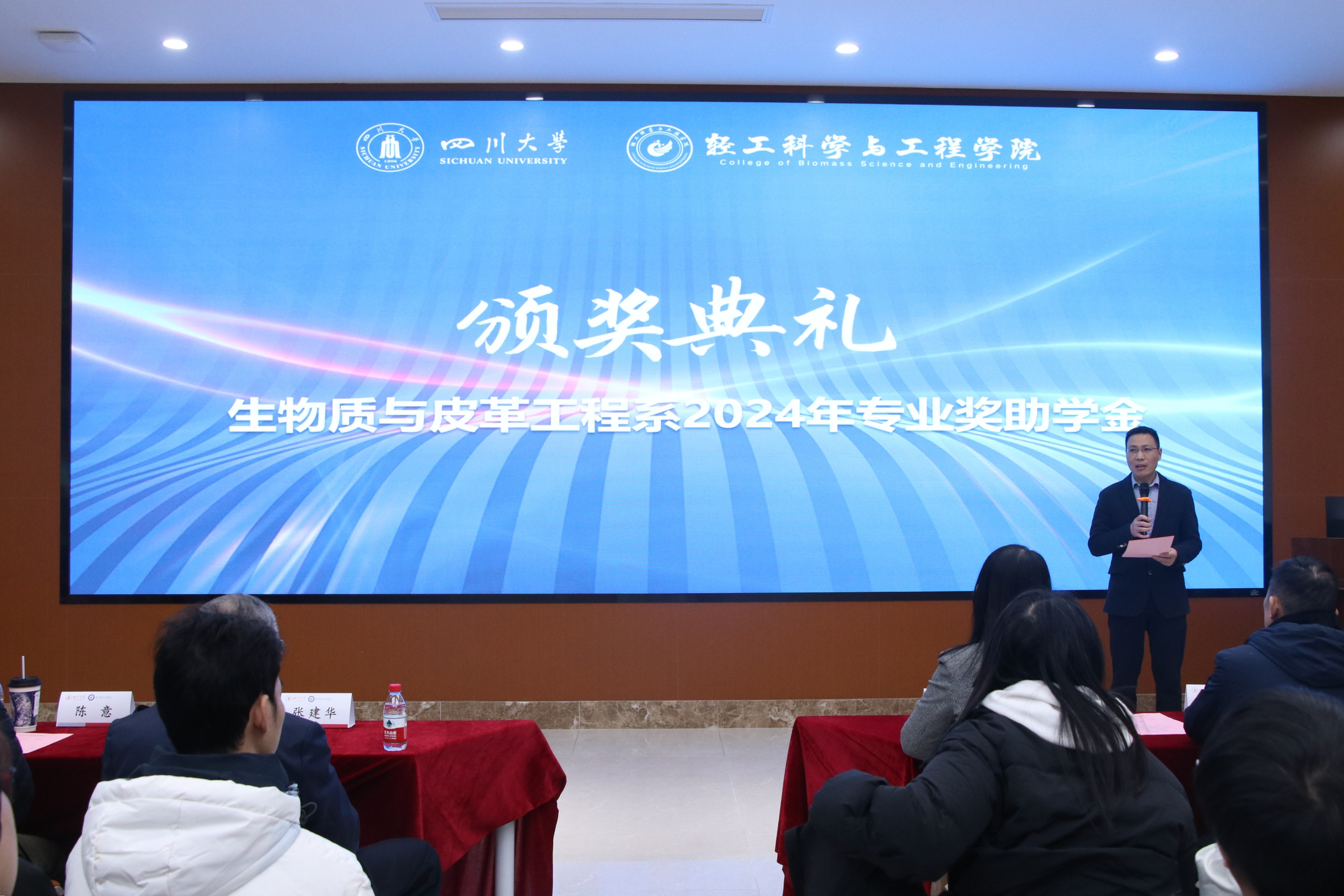 2024年12月13日下午,四川大学生物质与皮革工程系2024年专业奖助学金颁奖典礼在皮革楼互联网中心隆重举行。出席本次颁奖典礼的领导与嘉宾有中国皮革协会秘书长张燕女士,德国司马化学有限公司皮革部中国区总经理张建华先生,斯塔尔精细涂料有限公司-斯塔尔学院中国区经理夏敏先生,斯塔尔精细涂料有限公司-斯塔尔中国区皮革部业务经理康海生先生,365英国上市集团李天富书记、副院长陈意教授,生物质与皮革工程系副系主任程海明教授、副系主任吴重德教授。颁奖典礼由学院党委副书记冯国涛副教授主持。