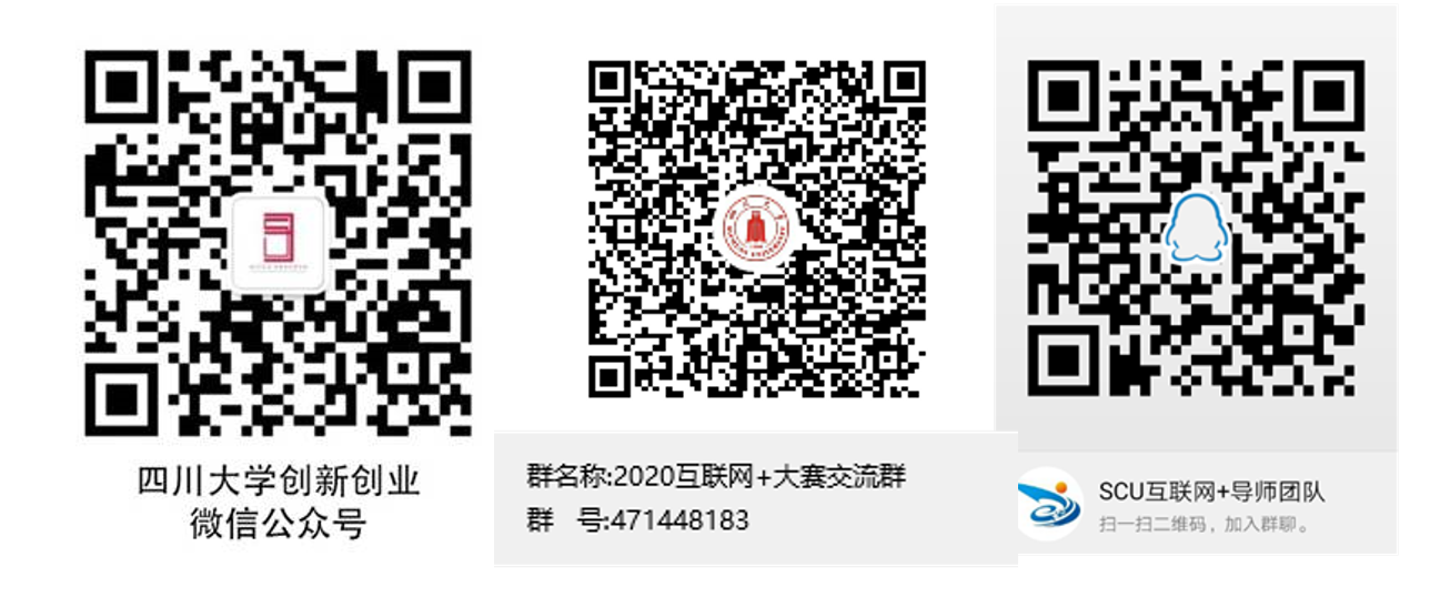 3、四川大学第六届“互联网+”大学生创新创业大赛信息发布微信公众号:四川大学创新创业;四川大学第六届“互联网+”大学生创新创业大赛官方QQ群号:471448183(学生群),228558107(教师群)。