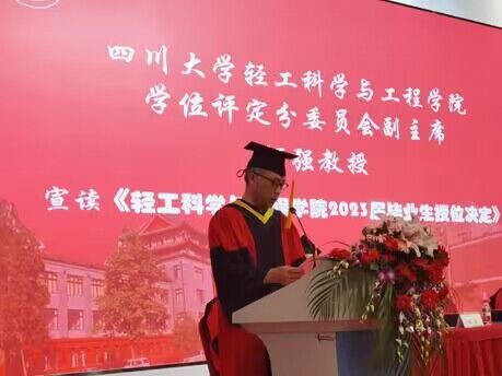 2023届轻化工程专业孙楠同学代表毕业生发言。他谈到,在川大四年的学习,从老师身上不仅学到了专业知识,更收获了治学的态度与人生的准则。虽然大家即将离开校园,踏上新的旅途,但川大“海纳百川,有容乃大”的胸怀时刻滋养着所有学生。他代表全体毕业生同学,感谢学校和学院提供的良好学习生活环境以及丰富的资源平台;感谢所有老师,为学生的学习发展以及后勤保障倾注了大量的心血。最后祝愿老师们工作顺利、身体健康,祝福各位同学扬帆远航,鹏程万里。
