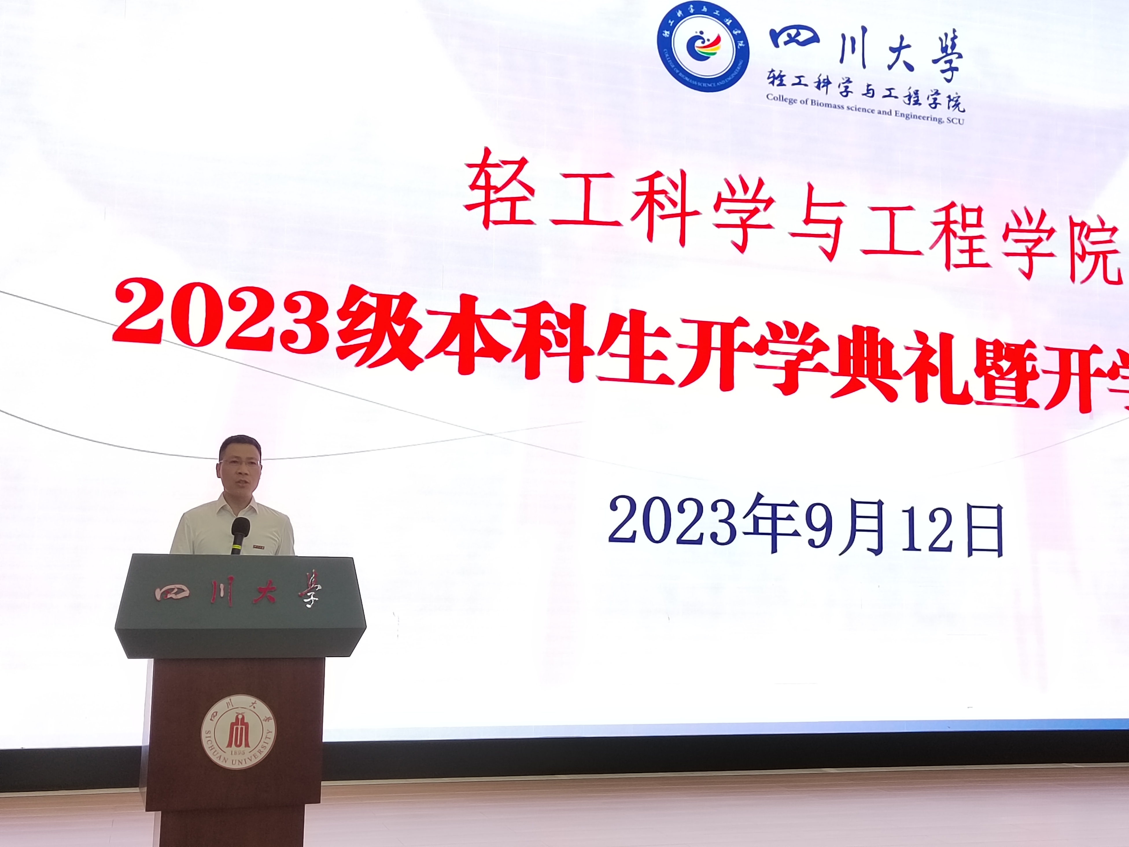 开学典礼在庄严的国歌声中正式开始。首先,院长彭必雨教授致辞。彭院长代表学院党政对顺利进入365英国上市集团的318名2023级本科生新同学表示最衷心的祝贺,对大家的到来表示热烈的欢迎,并对全体本科新生提出三点希望。第一,继续保持勤奋上进、不畏艰难的学习态度,做学习中最好的自己。彭院长希望同学们持续保持高中阶段勤奋好学、追求上进的学习态度,不畏惧困难,严于律己,尽快适应大学学习方法,让学习知识、增长才干成为大学的首要任务。第二,尽快适应开放自由、全面发展的大学环境,做大学中最好的自己。希望大家要充分运用好一流大学的教学、科研、图书馆等公共资源,在开放自由的大学环境中,将一流资源转化为推动自我成长、促进自我进步的积极因素,努力成长为全面发展的合格人才。第三,努力塑造人格健全、本领过硬的优良品质,做社会中最好的自己。希望同学们在大学期间进一步树牢社会主义核心价值观,塑造健全人格,锤炼过硬本领,成长为与双一流大学相匹配的品德高尚、气质优雅、才干出众的社会主义事业接班人,为国家轻工行业的高质量发展作出川大人应有的贡献!