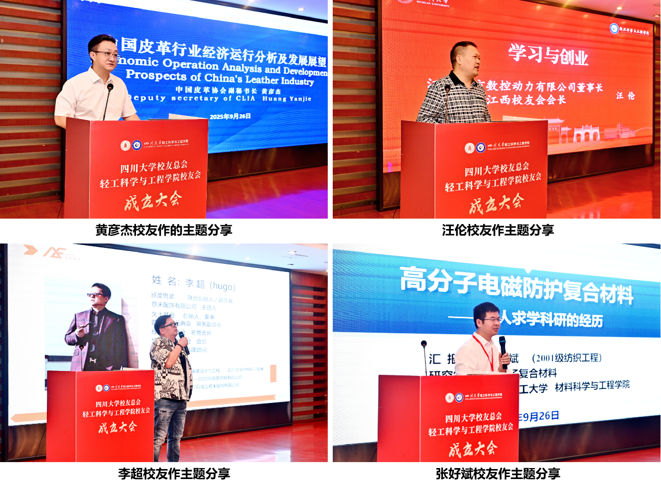 大会同期召开了校友论坛。学院彭必雨院长向到会嘉宾和校友介绍学院发展和办学成效,并展望校友会的美好未来。中国皮革协会副秘书长黄彦杰、江西直方数控动力有限公司董事长汪伦、成都意未服饰有限公司总经理李超、北京化工大学教授张好斌等校友分别作《中国皮革行业经济运行分析及发展展望》、《学习与创业》、《致往昔 创未来》、《高分子电磁防护复合材料——个人求学与科研的经历》的主题分享。