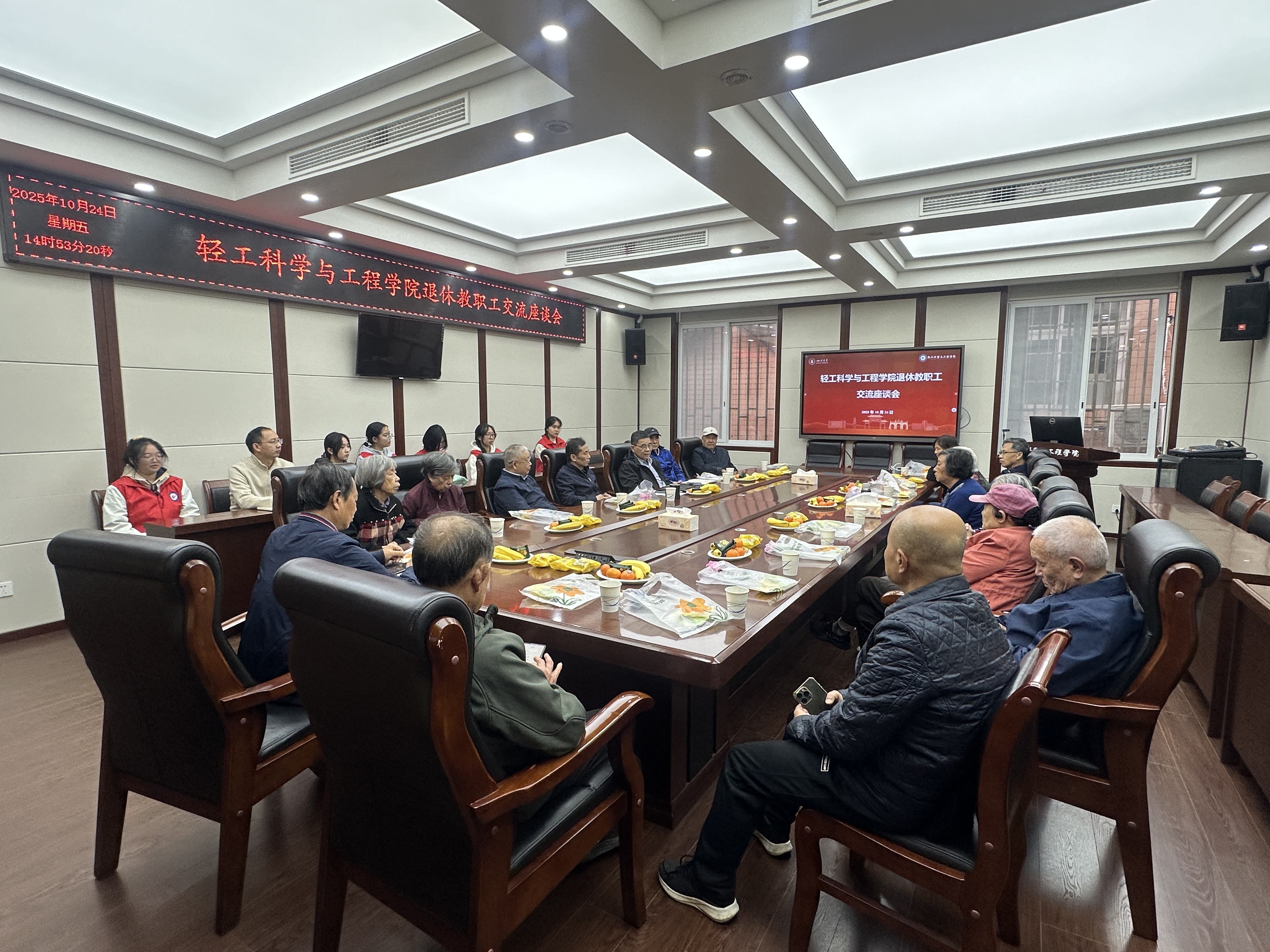 李天富书记聚焦学院近期重点工作,介绍了本科教育教学审核评估迎检、人才与师资队伍建设、党建工作提质增效等方面的具体推进情况。他认真倾听每位退休教师的发言,耐心回应大家对学院发展的关切,并不时记录宝贵建议。在交流尾声,李天富书记再次向老同志们表达感谢,既叮嘱大家保重身体、安享幸福晚年,也诚挚期盼大家继续以 “老轻工” 的智慧与经验,为学院未来发展多提宝贵意见。