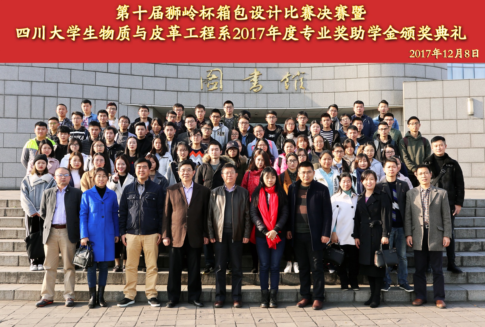 2017年12月8日下午16时,第十届 “狮岭杯”箱包设计比赛决赛暨四川大学生物质与皮革工程系2017年度专业奖助学金颁奖典礼于四川大学江安校区二基楼报告厅隆重举行。受四川大学生物质与皮革工程系的邀请,中国皮革工业协会秘书长陈占光先生、斯塔尔中国区毛皮市场经理刘智军先生、兰州科天投资控股股份有限公司品牌总监李春雨先生、广州欣驰皮革有限公司孙柳女士莅临了本次活动现场。参加本次活动的还有轻纺与食品学院党委副书记冯国涛老师、轻纺与食品学院副院长彭必雨教授、生物质与皮革工程系系主任林炜教授、副系主任周建飞副教授、吴重德副教授、杨璐铭副教授。生物质与皮革工程系全体获奖学生以及2016级、2017级全体本科生参与了本次活动。