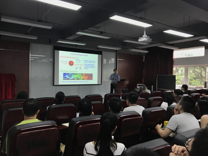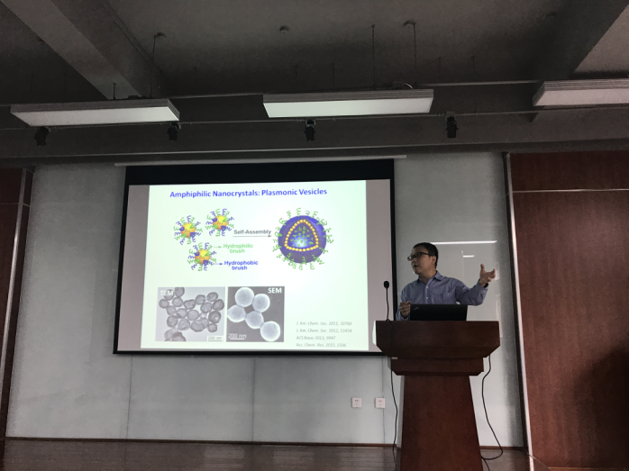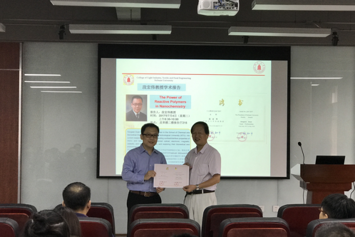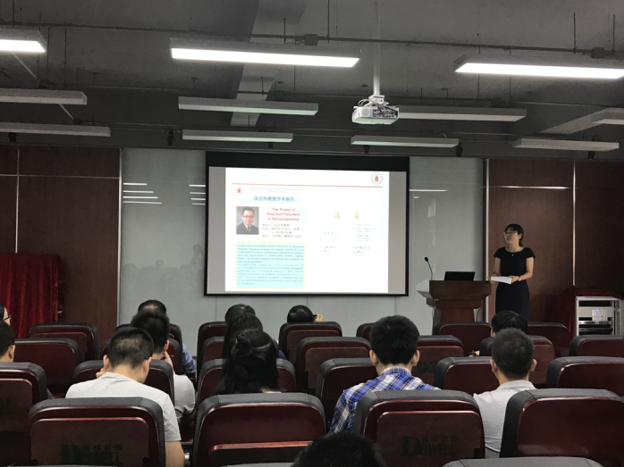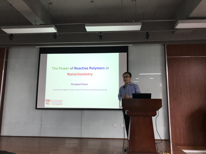 2017年7月4日,来自新加坡南洋理工大学化学与生物医学工程学院的段宏伟副教授对我院进行学术交流访问,并在皮革楼二楼报告厅做了学术报告会,报告会由我院林炜教授主持。段宏伟副教授在会上作了一场题为“The Power of Reactive Polymers in Nanochemistry”的学术报告,介绍了其主要的研究方向和最新的研究成果。该会不仅有我校大量教师、研究生、本科生参加,还吸引了部分校外的学者们前来交流讨论。最后,大家带着思考和收获,以热烈掌声感谢段宏伟副教授的精彩学术报告,报告会在轻松活跃的气氛中落下帷幕。段宏伟教授本科和硕士分别就读于复旦大学化学系和高分子系,师从江明院士。他于2005年在马克思普朗克胶体界面研究所Helmuth Möhwald教授研究组完成博士论文,之后在佐治亚理工和Emory大学生物医学工程系和聂书明教授从事博士后研究。他在2009年加入新加坡南洋理工大学化学与生物医学工程学院,并于2015年晋升终身副教授。2017年被聘为四川大学客座教授。目前他的研究内容主要集中在通过理解调控微纳结构的表面-界面性质实现相应材料在生物医学和环境工程领域的应用。