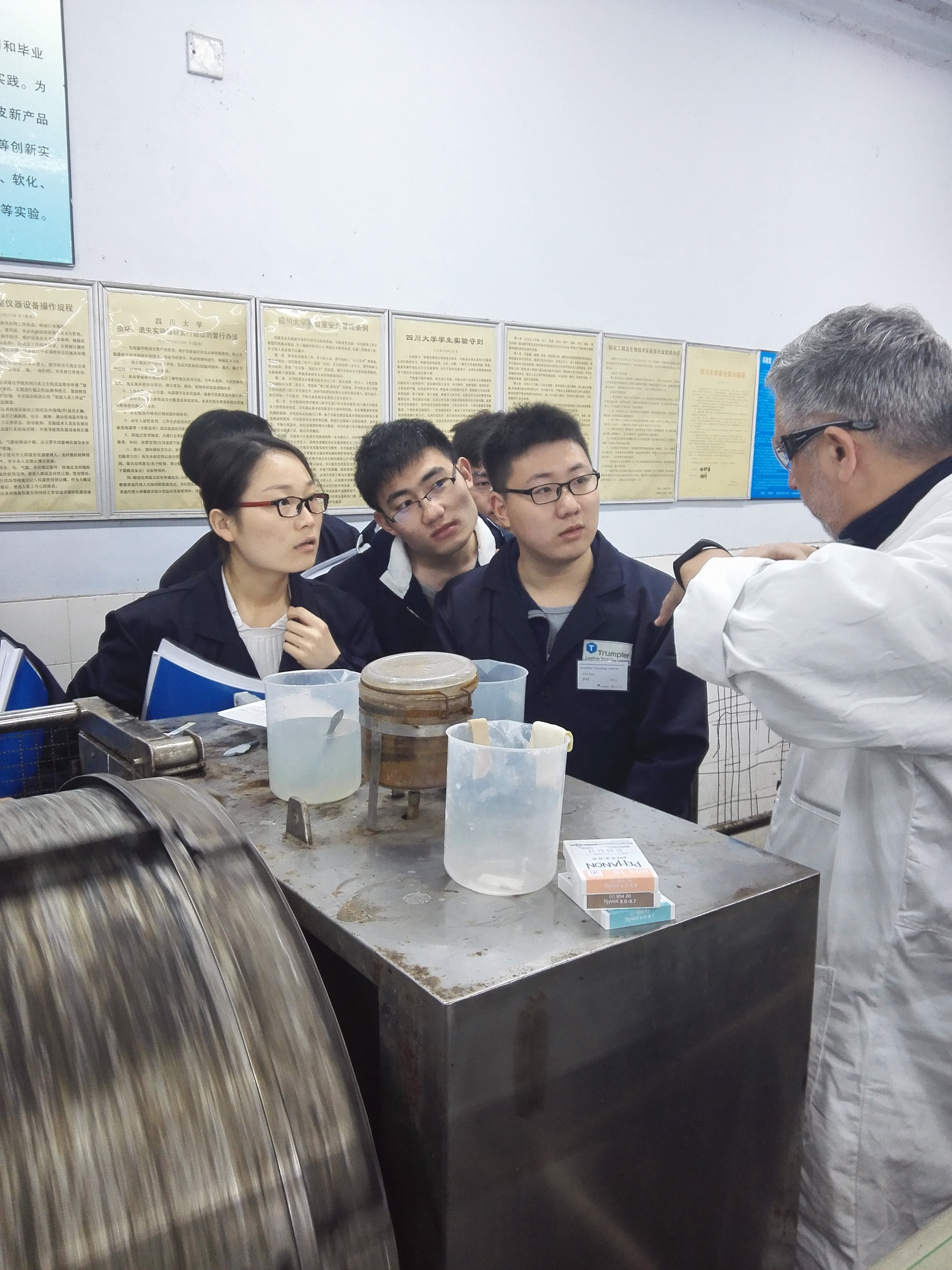 陕西科技大学轻工技术与工程学院皮革系副系主任许伟博士、嘉兴学院材料与纺织工程学院轻化工程系主任罗建勋副教授、齐鲁工业大学皮革化学与工程学院教师王玉路博士、齐齐哈尔大学轻工与纺织学院副院长宋秘钊教授等,四川大学轻纺与食品学院院长何有节教授、党委副书记刘晓虎副教授、生物质与皮革工程系主管本科教学副系主任彭必雨教授、主管研究生和科研副系主任林炜教授、主管行政副系主任张宗才教授,学院本科生和研究生辅导员李晓秀、冯国涛、苏德强以及相关专业的教师等参加了开班仪式。开班仪式由川大轻纺与食品学院生物质与皮革工程系轻化工程及生物工程本科生实验室主任陈慧副教授主持,何有节院长致辞。参加本次培训班的五所高校轻化工程专业全体学员、四川大学2014级轻化工程专业和2015级成教轻化工程专业(皮革工程方向)的全体同学参加了本次开班仪式和公开讲座。 本期“汤普勒—四川大学制革技术培训班”是为了提高我国轻化工程专业(皮革工程方向)学生的工程实践能力,增进中国开设轻化工程专业(皮革工程方向)各高校同学和教师的交流,培养与国际市场接轨的制革专业技术人才而举办的。培训班采用课堂教授与实践相结合的方式,讲授牛皮鞋面革和羊皮服装革的试制技术,由汤普勒(Trumpler)集团产品交流和推广经理Dr.Jeffry Guthrie-Strachan(国际皮革工艺师和化学家协会联合会(IULTCS)IUT培训委员会主席)及汤普勒公司其他工程技术人员担任培训主讲,并具体指导学生现场实验和操作。