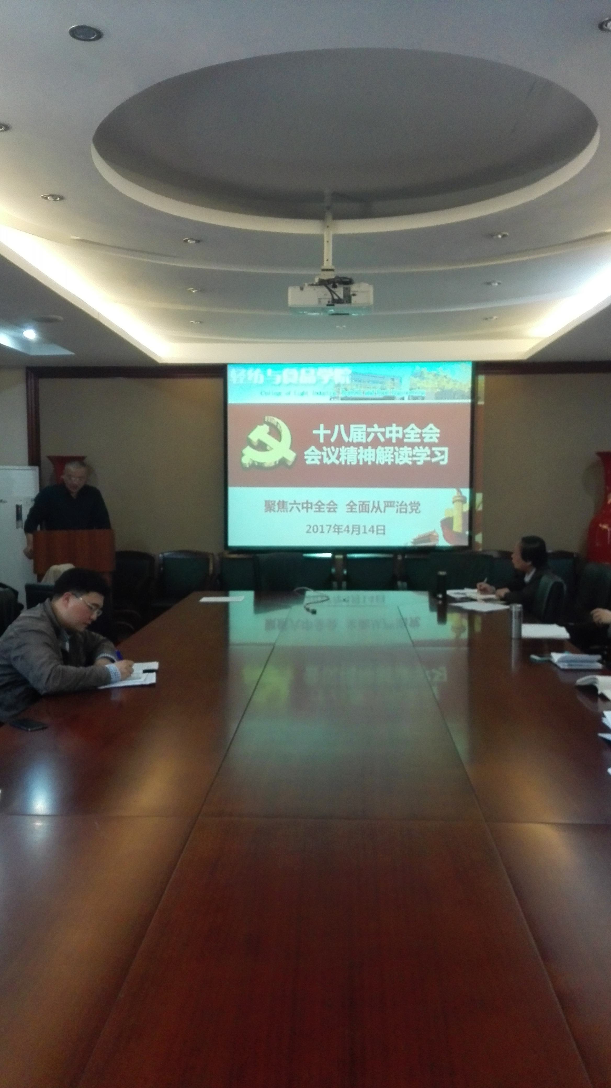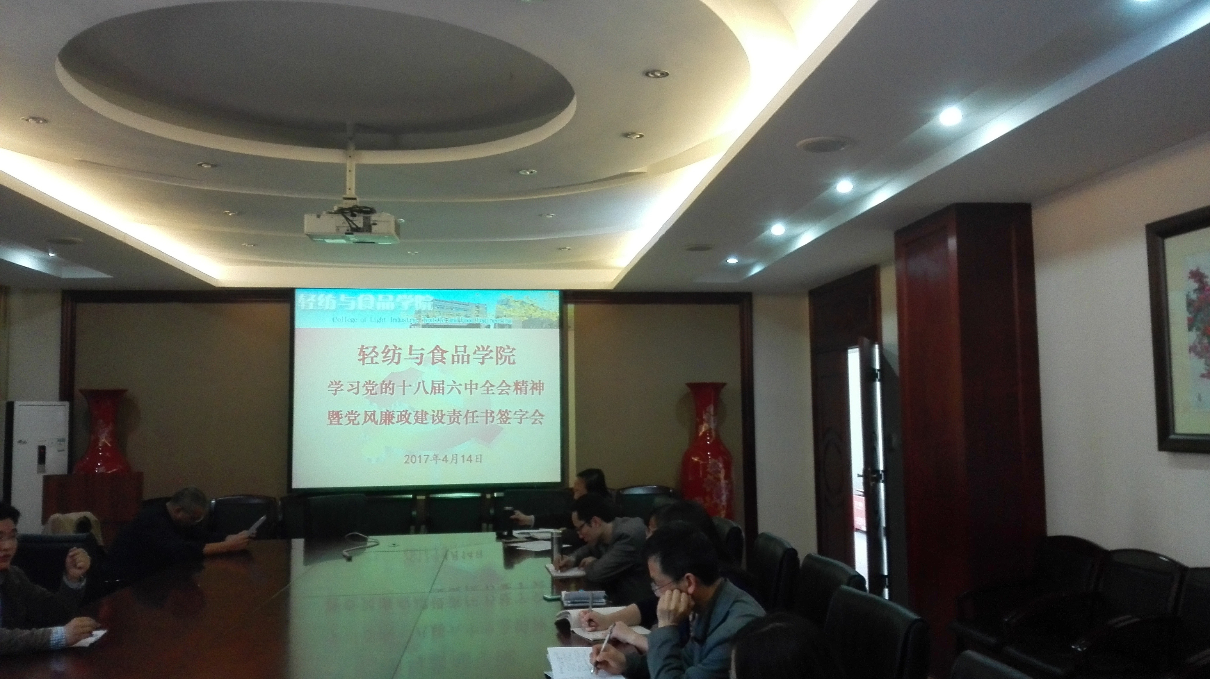 4月14日下午,我院在皮革楼209会议室举行学习十八届六中全会精神暨党风廉政建设责任书的签署大会。参加此次会议的有学院中层领导干部,党委委员、纪委委员,工会主席,科级干部,系所负责人,教职工党支部书记及支委,学生党支部书记及支委。会议由学院副书记兼纪委书记刘晓虎同志主持。赵毅书记就十八届六中全会精神进行了深入的解读,分别从此次会议的主题及议程,核心的确立,加强和规范党内的政治生活,加强党内监督条例四个方面做了重点阐述,让与会人员对十八届六中全会精神有了一个比较全面而深入的认识。在赵书记的讲课之后,由刘书记主持,学院中层领导干部、系主任、教职工党支部书记、科级干部分批签署了党风廉政建设责任书。