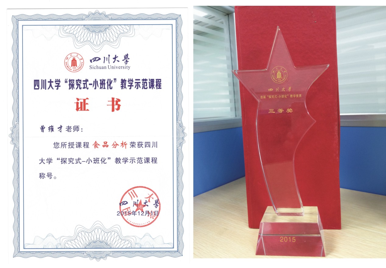 根据四川大学文件(川大教[2015] 193号)“关于表彰首届四川大学“探究式-小班化”教学竞赛获奖教师的决定”通知,我院食品工程系曾维才老师荣获“四川大学首届“探究式-小班化”教学竞赛三等奖”,由其主讲的本科课程《食品分析》获得“四川大学“探究式-小班化”教学示范课程”的称号,这是我院积极进行响应学校在本科教学中,通过启发式讲授、互动式谈论、全过程考核、非标准答案考试等多项举措激发学生主动学习的热情,提高学习成效的良好体现,也是我院本科教学改革的一项可喜成果。