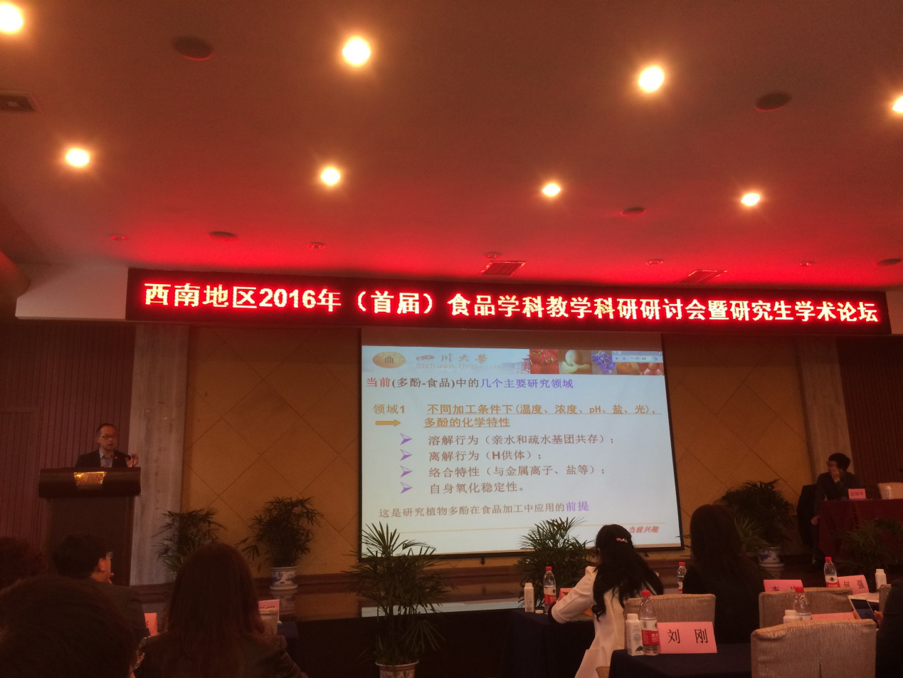 本次会议以“主题报告”、“专业培养方案交流与借鉴会”、“研究生学术论坛”三主题四会场的形式展开。23日上午开幕式结束后,何强教授首先就“食品科学中的植物多酚”进行了主题报告并简单介绍了我院学科团队建设及人才引进情况;下午,何贵萍老师从具体课程建设、新型教学体系构建、实验实践教学方法、教学管理、学生创新创业的培养等方面围绕着“食品科学与工程创新教育方案”主题进行了交流;而“研究生学术论坛”则围绕西南地区优势传统特色食品的工艺现代化,生产过程机理作用,食品安全评价及原料控制为重点进行讨论,我院也派出了学生代表卢云浩进行了“苯二酚对亚硝酸盐清除作用的比较研究”的学术报告。