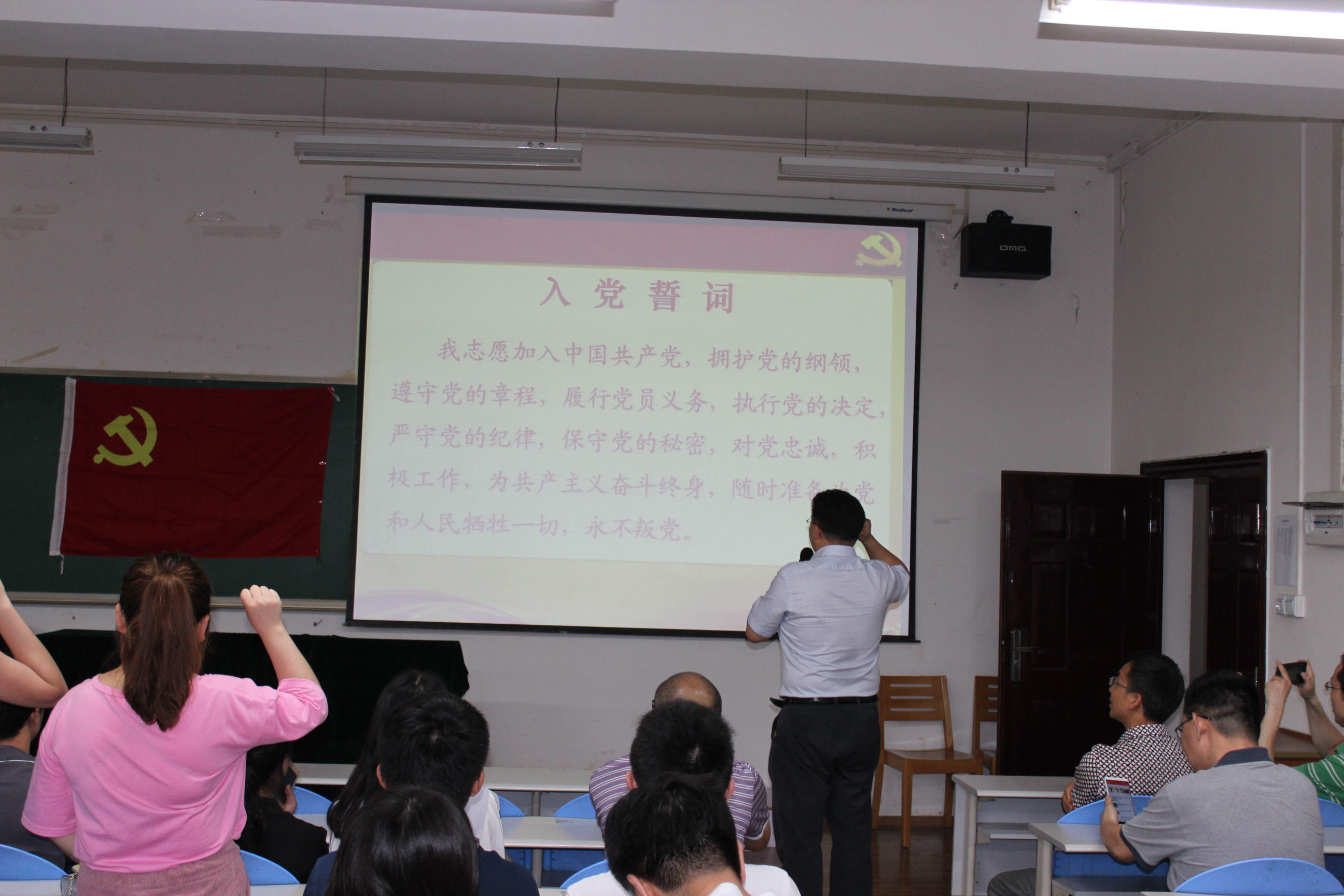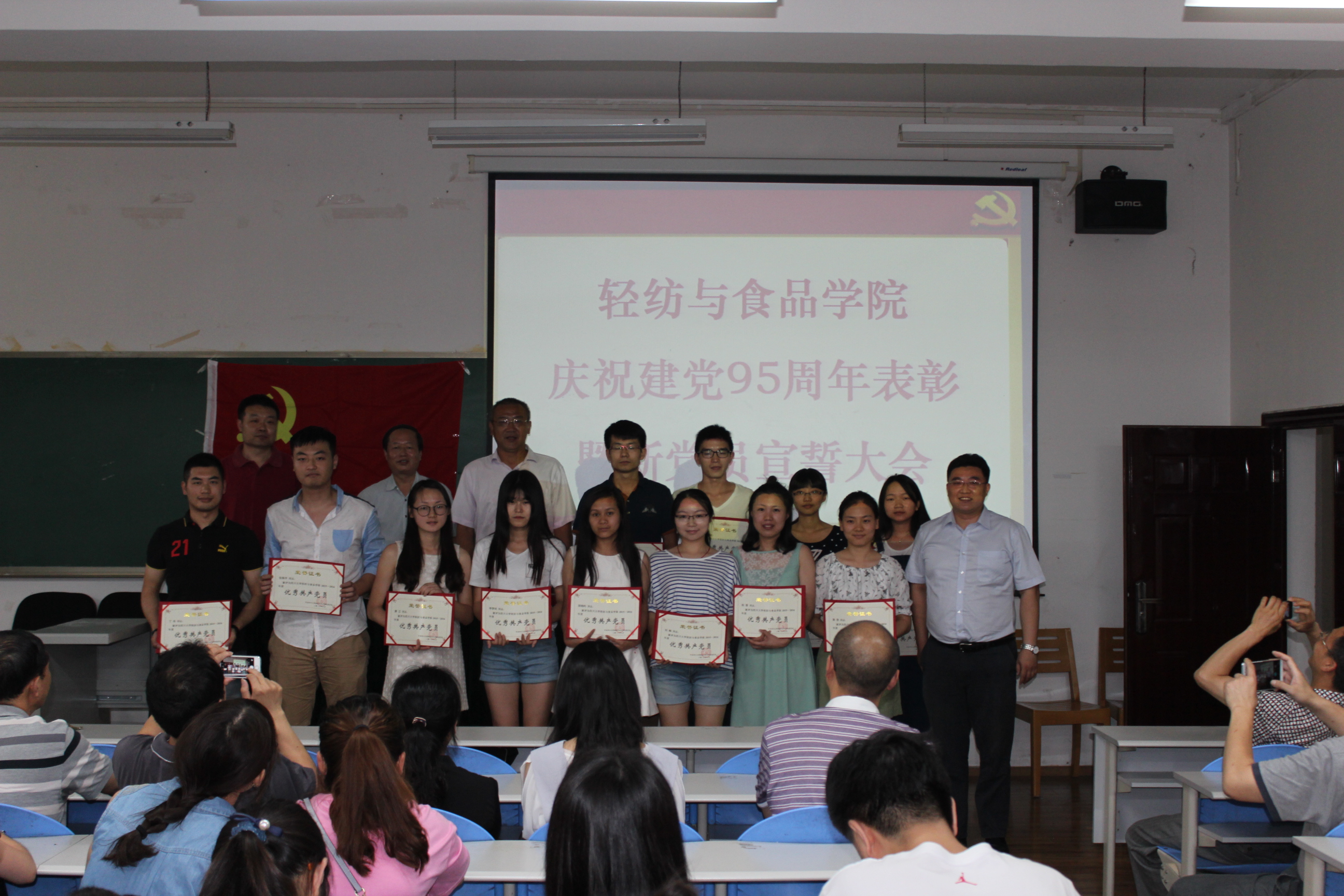 6月12日下午,我院全体党员在纺工副楼205会议室举行建党95周年表彰暨新党员宣誓大会。会议由院长何有节教授主持。他向获得表彰的支部和师生表示祝贺,希望他们再接再厉,再创辉煌。赵毅书记发表了热情洋溢的讲话,他说,今年是国家十三五的开局之年,是学校一流学科和一流专业建设之年,也是学院制定新的发展目标,实现跨越式发展的起步之年,学院党委将紧紧团结和依靠全体党员和全院师生,坚持“围绕中心抓党建,抓好党建促发展”,高举中国特色社会主义的伟大旗帜,以邓小平理论和“三个代表”重要思想为指导,深入贯彻落实科学发展观,认真学习习近平总书记系列讲话精神,认真开展“两学一做”专题教育,充分发挥基层党组织的核心作用,党支部的战斗堡垒作用和党员的先锋模范作用,不断加强理想信念教育,牢记党的宗旨,不辱使命,以实际行动来迎接建党95周年,为早日实现学校建设一流综合性大学的奋斗目标而贡献自己的力量。 接着,肖凯副院长宣读了获奖名单,学院领导为获奖的支部和师生党员颁奖。2014级硕士生党支部书记江明芳同学,作为优秀党员代表发言。最后,刘晓虎副书记作为领誓人,主持了新党员的宣誓仪式。大会圆满落幕!
