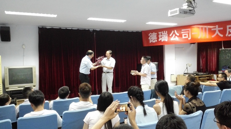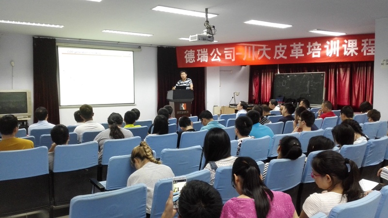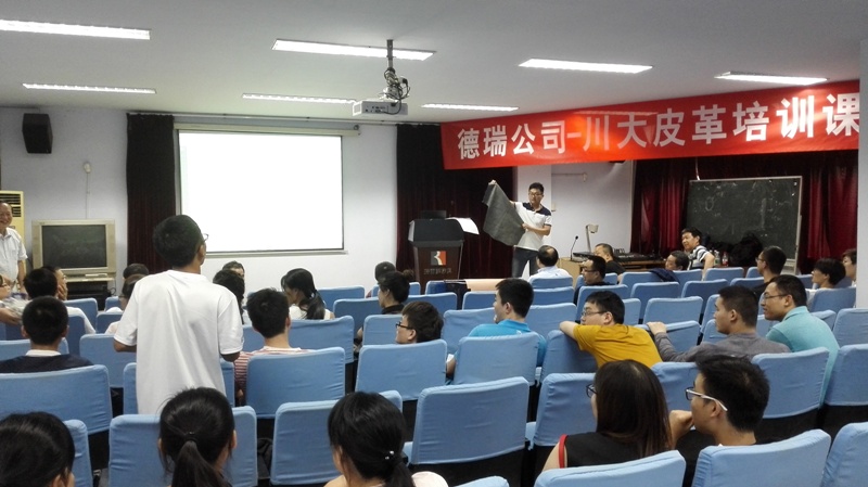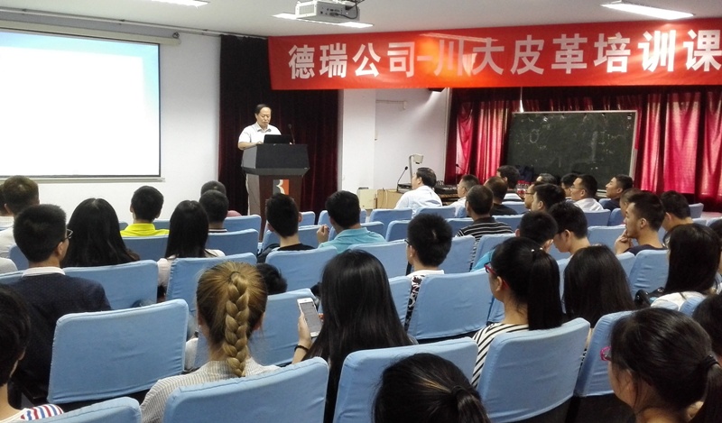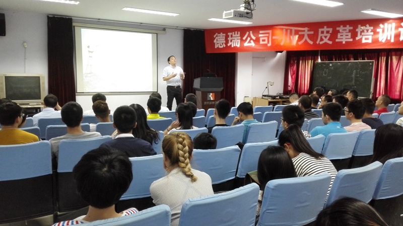2016年6月15日下午14:00,德瑞(TFL)公司销售副总裁徐怀海先生一行8人应邀来我院访问并开展培训课程及联谊活动。德瑞—四川大学皮革培训课程在四川大学望江校区皮革楼205报告厅举行,活动由四川大学轻纺与食品学院院长何有节和德瑞公司销售经理姚兵校友主持。德瑞公司代表团、院长何有节教授、皮革系对外联络办公室主任周华龙教授、生物质与皮革工程系党支部书记程海明副教授、学院团委书记苏德强老师、团委副书记李晓秀老师以及轻化工程专业卓越工程师班的学生参与了本次活动。 何有节院长发表了热情洋溢的致辞。何院长首先代表学院向德瑞公司代表团的到访表示热烈的欢迎,他回顾了德瑞公司与川大皮革系的深厚友谊及在人才培养、技术开发方面的合作历程,重点介绍了德瑞公司在皮革环境友好材料开发应用方面所取得的成就,勉励参与课程的同学能在课程和联谊活动中珍惜难得的机会与德瑞公司代表团成员们积极互动。 德瑞公司销售副总裁徐怀海先生对德瑞公司以及皮革行业做了详细的介绍,强调了皮革行业的发展前景如何有节院长所说的“日不落产业”,认为德瑞的重心在于解决皮革行业所面临的现实问题。随后,德瑞公司技术总监周利军校友、高级技术代表何杰校友以“现代制革业的破局——时尚/环保与传统工艺的融合”为题,对德瑞公司在水场准备工段的解决方案做了详细的介绍,并与现场同学进行了热烈深入的交流互动。培训课程第一单元结束后,参与培训课程的师生利用茶歇时间在皮革楼209会议室参加了德瑞公司最新时尚皮革品种路演活动,并与德瑞代表团成员就感兴趣的皮革品种的制作工艺以及皮革化工材料使用情况进行了热烈的讨论。最后,德瑞代表团对皮革涂饰工艺进行了解析,并和参加培训会的同学对工艺细节进行了讨论,整个过程气氛热烈。活动结束后,德瑞代表团和轻纺与食品学院生物质与皮革工程系互赠了礼物。所有参与培训会的师生和代表团成员们参与了后续的联谊活动。 德瑞(TFL)—四川大学皮革培训课程暨联谊活动增强了轻纺与食品学院与德瑞公司的交流,不仅让同学们了解了更多的皮革工艺知识和行业发展前景,更激发了学生对皮革行业传统与环保问题的思考。