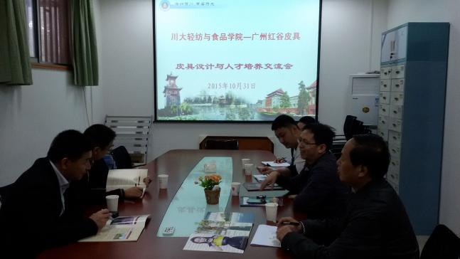 2015年10月31日,广东红谷皮具(集团)有限公司总经办余敏华总经理、Hr胡军总监来我院,与革制品教研室徐波主任、曾琦老师、周晋博士,肖凯副院长、何有节等,就皮具设计研发合作、实习基地建设、人才培养、招聘学生等进行交流。何有节院长和余敏华总经理分别介绍了校企双方的情况。徐波主任介绍了四川大学皮革工程系轻化工程专业(革制品设计方向)本科生培养和革制品工程与材料博士点的情况;曾琦老师和周晋博士分别了我院轻化工程专业革制品设计、服饰设计研发和教学情况。