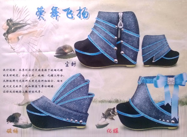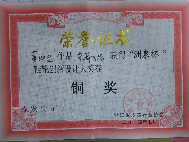 日前,由浙江省皮革行业协会主办的“桐乡·洲泉杯”鞋靴设计大奖赛”落下帷幕,比赛组委会共收到了来自几百位企业和高校选手的作品。本次比赛分为效果图部分和实物鞋制作两个部分,我院2010级轻化工程专业革制品设计方向的同学在效果图部分比赛中获得了优异的成绩:其中董坤坚同学的作品《荧舞飞扬》获得了大赛铜奖,此外还有部分同学获得优秀奖。(姚云鹤)