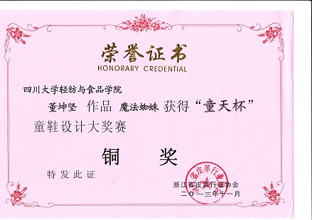 日前,由浙江省皮革行业协会主办、浙江宝路鞋业有限公司承办的第二届“童天杯”童鞋设计大奖赛落下帷幕。经过专家们的精心评选,最终确定了金银铜奖得主。我院革制品设计方向2010级本科的董坤坚的设计作品《魔法蜘蛛》获得了本次大赛的铜奖。期望同学们再接再厉,取得更优异的决赛成绩。姚云鹤供稿