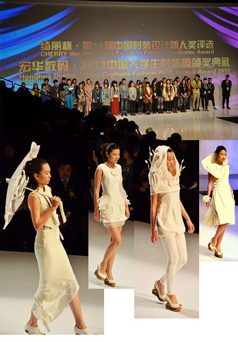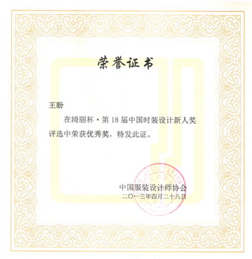 由中国服装设计师协会与绮丽集团有限责任公司主办的“绮丽杯”第18届中国时装设计新人奖评选于4月27日在北京拉开帷幕,颁奖活动与2013中国大学生时装周颁奖典礼同期同台举行。“绮丽杯”中国时装设计新人奖评选目前已成为国内各时装专业院校交流与学习的平台,新人奖组委会共收到来自全国77所服装院校推荐的762位学生报名参评,经初评,共有43位优秀学子入围。大赛评委通过了对参评选手作品成衣、现场命题立体裁剪以及网络选票方面的评比,最终,我院12级服装设计与工程专业研究生王盼在这次比赛中荣获第18届“绮丽杯”新人奖优秀奖。指导老师吴晶、李晓蓉。