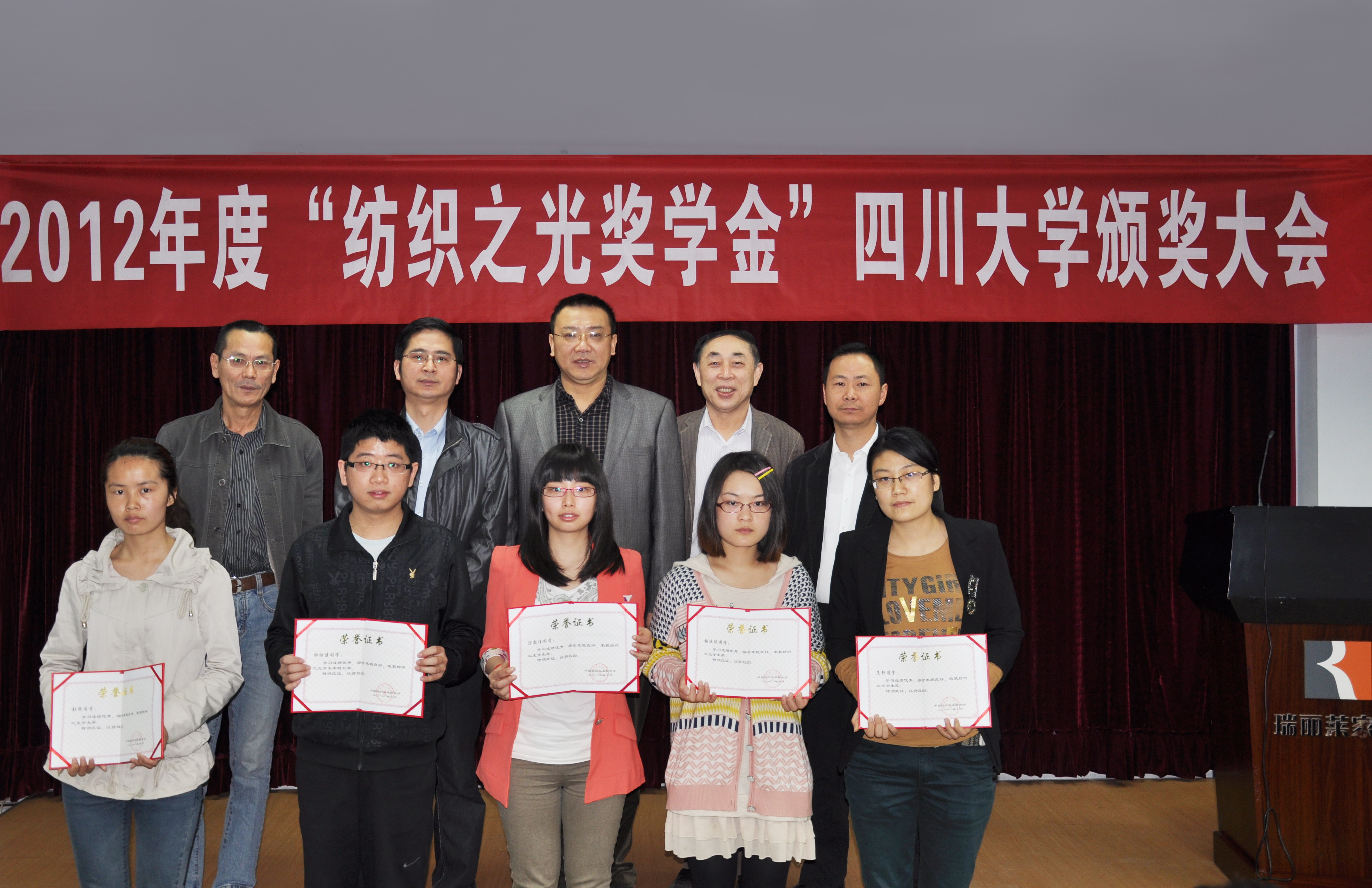 2013年3月16日在我院皮革楼报告厅隆重举行了“纺织之光”奖学金四川大学颁奖大会,学院党委书记赵毅、副院长兰建武、纺织系副系主任郑庆康、张皋鹏和陈衍夏教授出席,纺织与服装工程系本科生和研究生代表共100余人参加,大会由学生科科长冯国涛主持。
