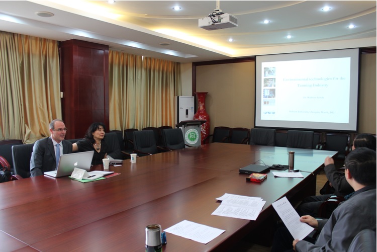 2013年3月29日,英国W2O环境公司总经理Wolfram Scholz博士及其助手 Nathalie Huc女士到轻纺与食品学院访问。上午9点30分,轻纺与食品学院党委赵毅书记、何有节院长、学院党办李慧主任、生物质与皮革工程系和制革清洁技术国家工程实验室外事秘书陈意等在皮革楼会议室与Scholz博士一行进行了会谈。赵毅书记首先致辞,向来访嘉宾表达了最诚挚的欢迎。随后,何有节院长向Scholz博士介绍了轻纺与食品学院的整体概况及皮革系的历史沿革、学科建设现状及对外交流情况等。Scholz博士随后与赵毅书记、何有节院长、李慧主任、陈意老师就未来以讲座教授身份来皮革系开展教学科研工作等事宜交换了意见。