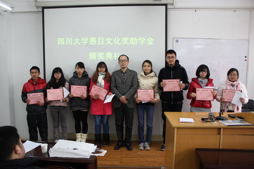 2012年12月28日中午1点,2012年度四川大学愚目文化奖助学金颁发仪式在食品工程系纺工楼202多媒体教室顺利举行,参加颁发仪式的有成都愚目文化传播公司周志明总经理,轻纺与食品学院副院长、食品工程系系主任何强教授,院党委副书记刘晓虎副教授,团委书记苏德强老师,2010级辅导员段飞霞老师,食品工程系邹华雄老师以及食品科学与工程专业全体获奖学生。颁奖典礼由院党委副书记刘晓虎主持。