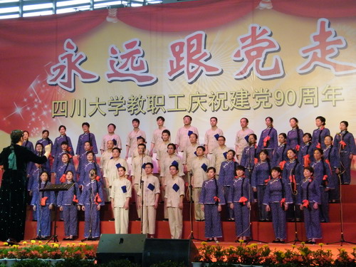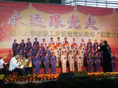 为纪念中国共产党建党90周年,5月27日下午,四川大学教职工“红歌大家唱”歌咏比赛在望江校区体育馆隆重举行。校党委书记杨泉明教授,校党委常务副书记罗中枢教授,校党委副书记周学东教授,校党委副书记、纪委书记徐兰教授出席了大赛。来自全校40个部门和单位的5000余名教职工参加了歌咏比赛。开幕式由校党委常务副书记罗中枢教授主持。 校党委书记杨泉明教授在开幕式上讲话,在全场高声齐唱《没有共产党就没有新中国》的雄壮歌声中,“红歌大家唱”歌咏比赛正式拉开序幕。我院教职工以一曲《十送红军》的精彩演唱,获得了本次歌咏比赛三等奖。 此次歌咏比赛时间紧,任务重,但我院教职工积极参与,认真准备,通过唱红歌的形式,表达对中国共产党的深切热爱,以实际行动表达为学校改革建设的决心。(lihui)